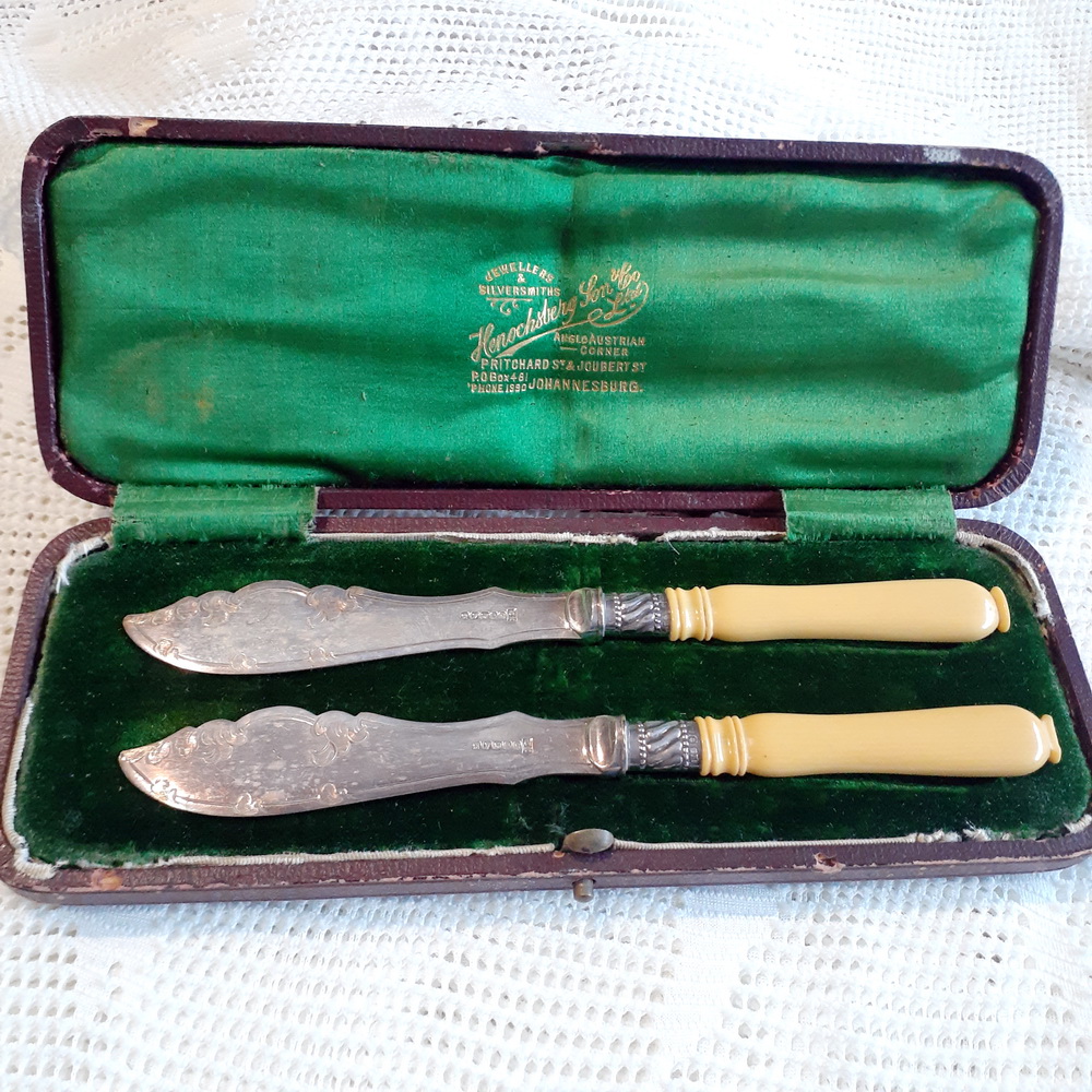Boxed Master Butter knives – hallmarked Silver Collars French Ivory handles EP