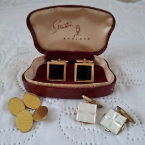 3 cuff links and box – Onyx? Mother of Pearl and Gold Tone