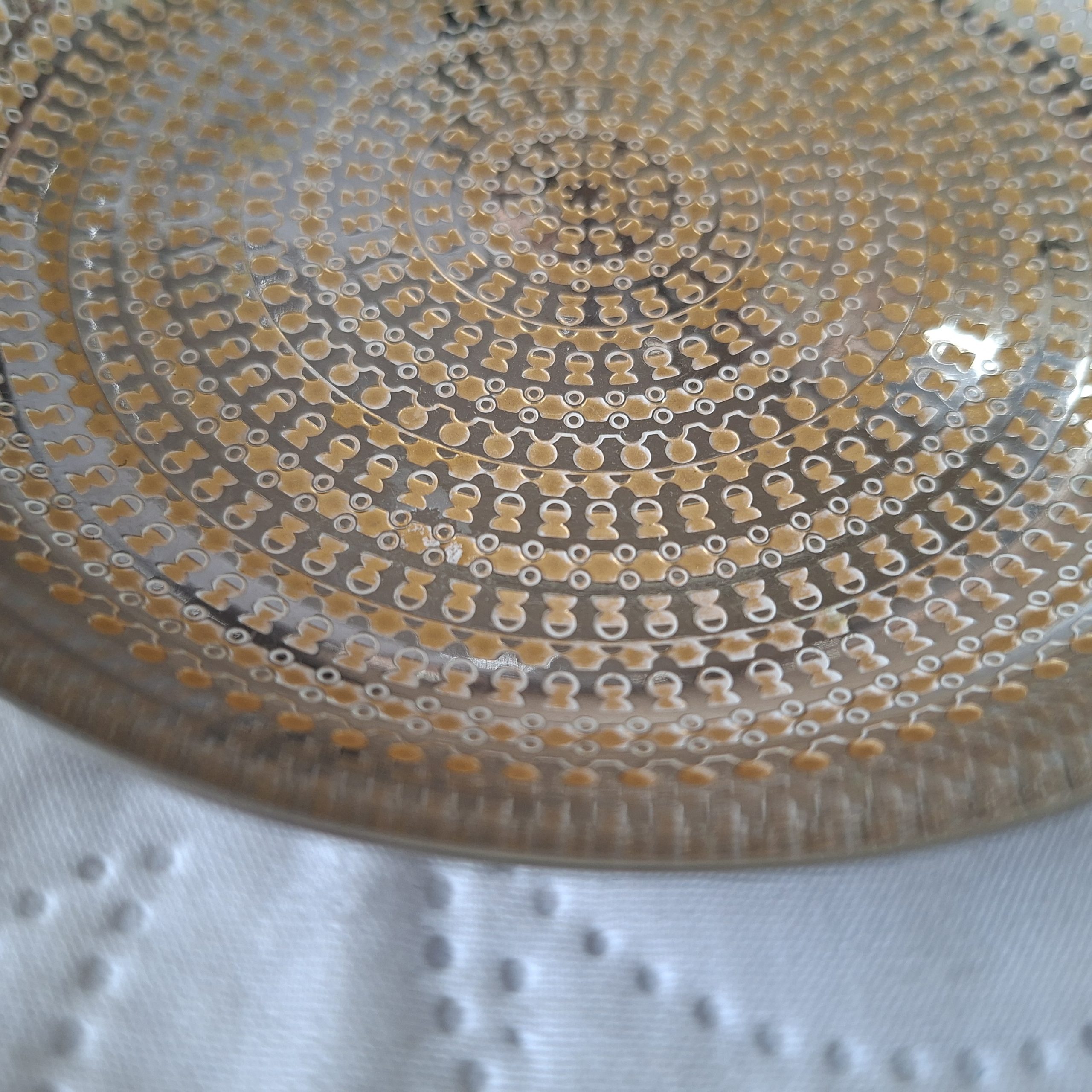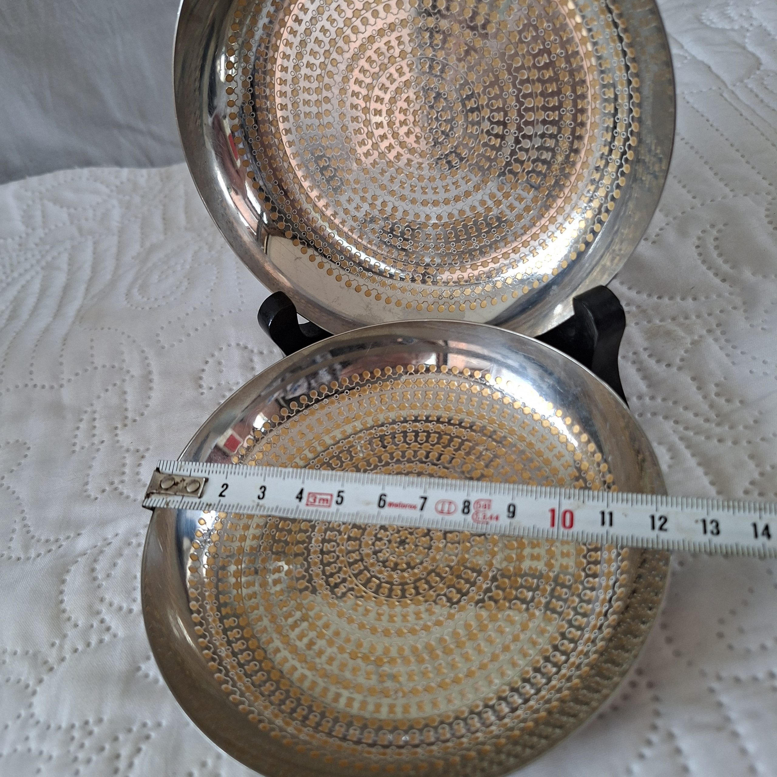 Two WMF Germany stainless steel coasters or flat bowls. Made in about the 70’s, they are in good used vintage condition. Some fine scratches to the bases otherwise is really nice condition. The design is embossed in gold. Questions welcome. Pictures for part of my description.