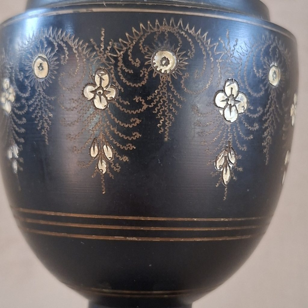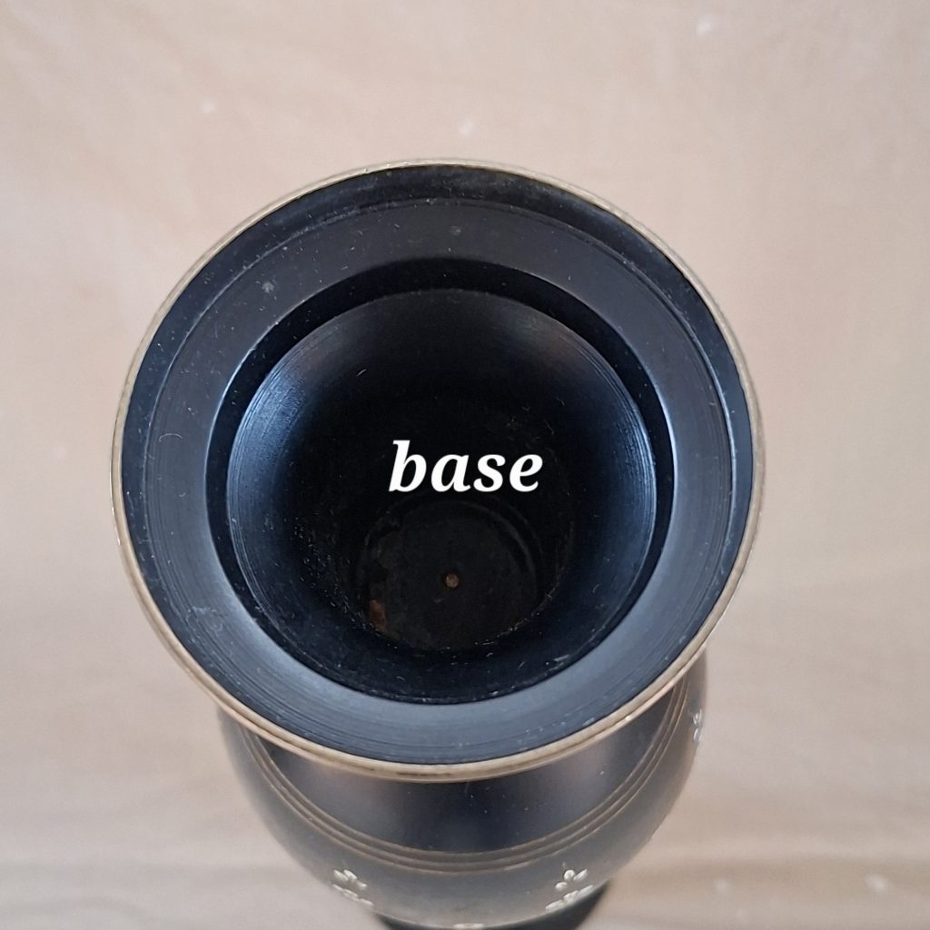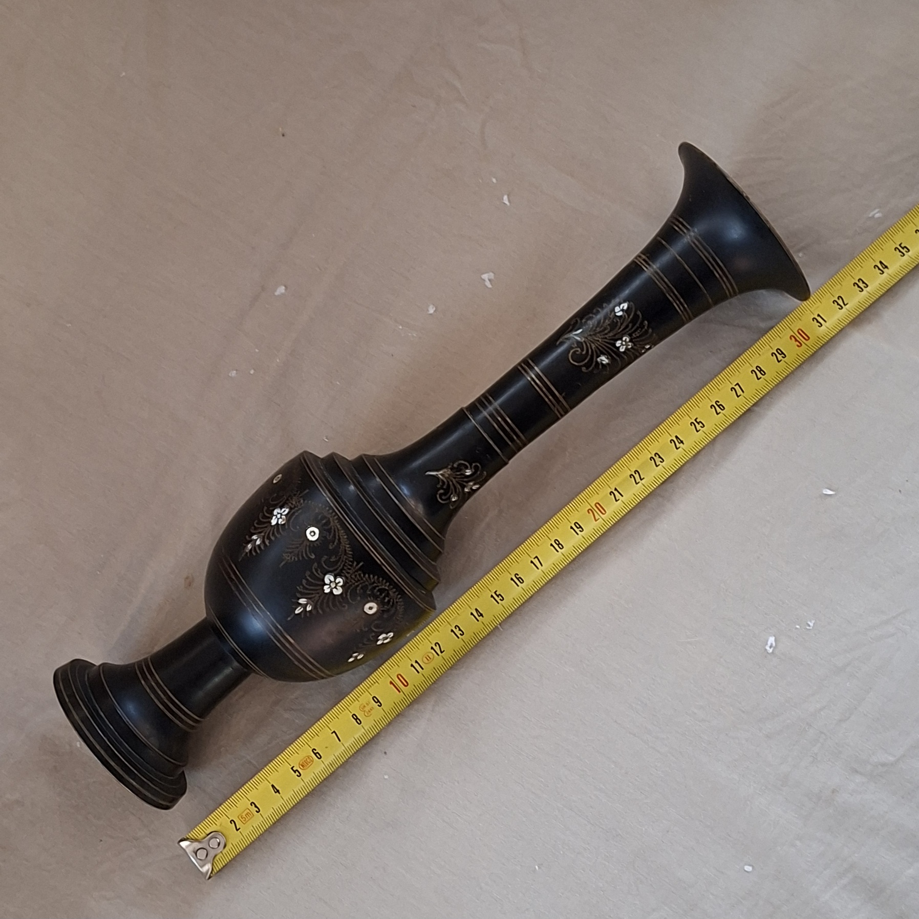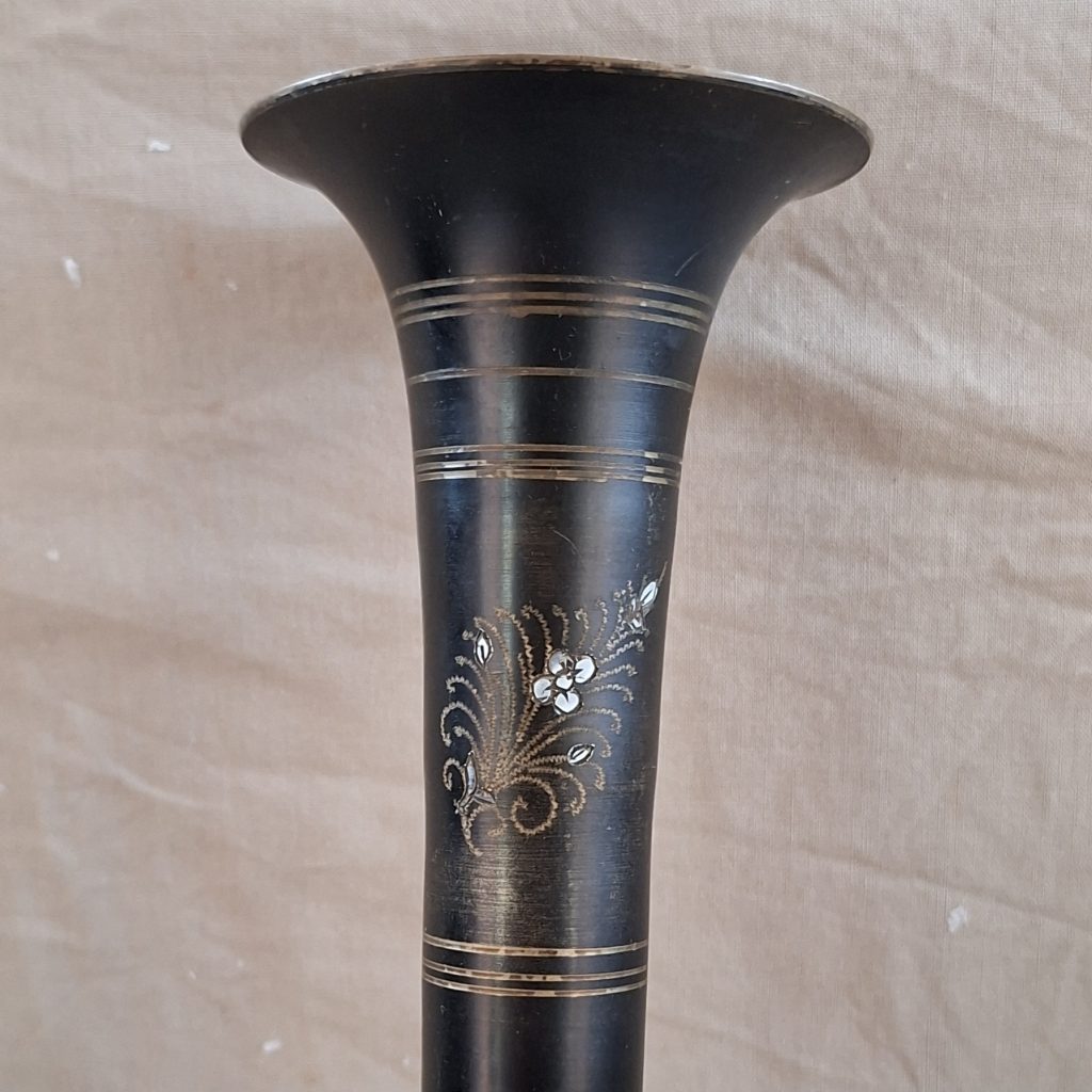 Vintage tall black brass etched vase probably Indian. In good used condition no condition issues. Finely etched through the black exterior. Dont hesitate to ask any questions.