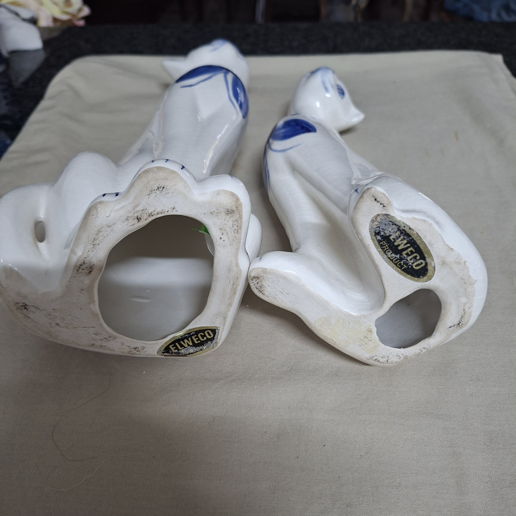 Such a pretty impressive duo.   Tallest figurine standing 33 cms tall.  Pair of hand painted blue and white vintage cats.   No chips or cracks.   Elweco paper brand underneath.   Some crazing from age.   Please look at the pictures carefully and dont hesitate to ask any questions.