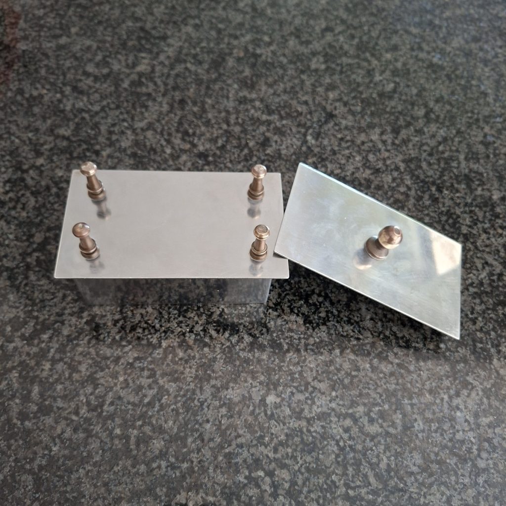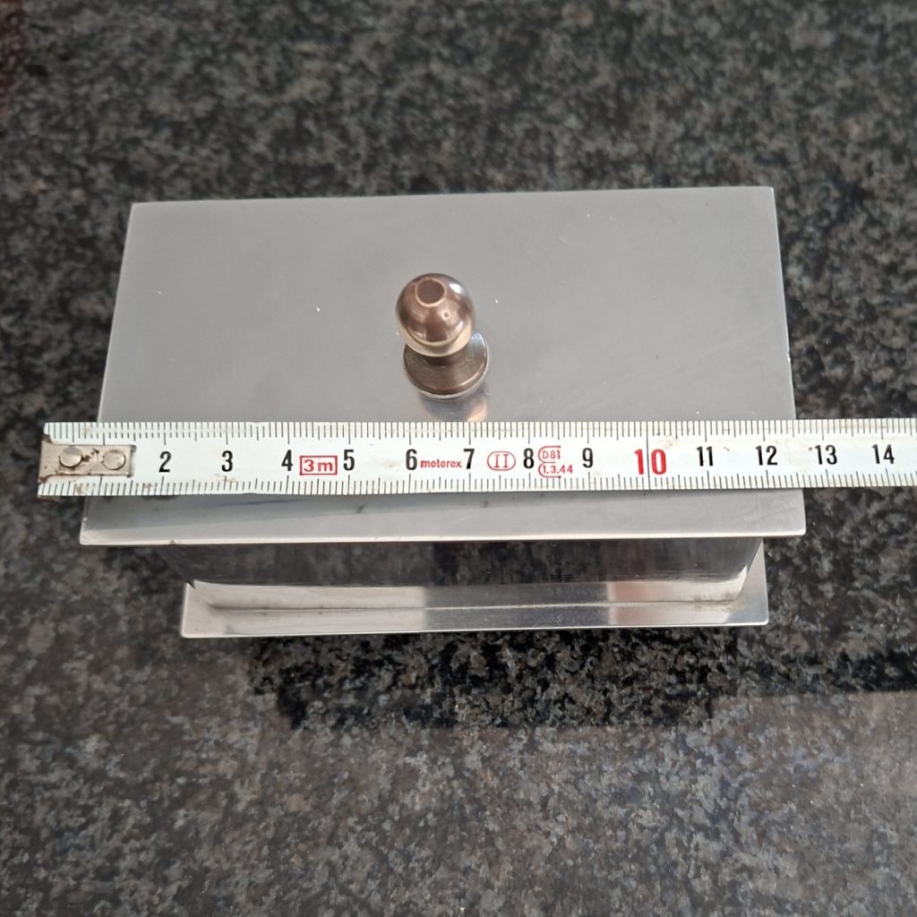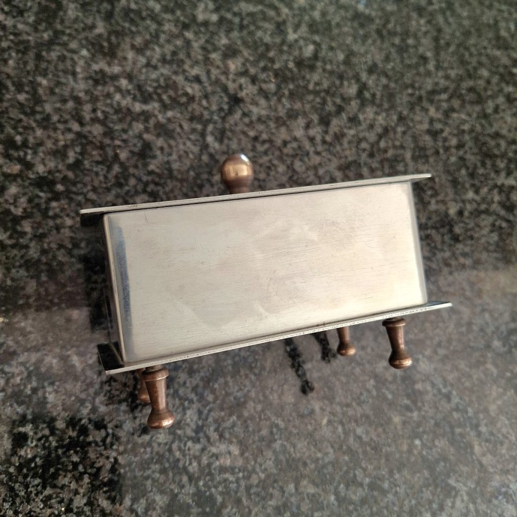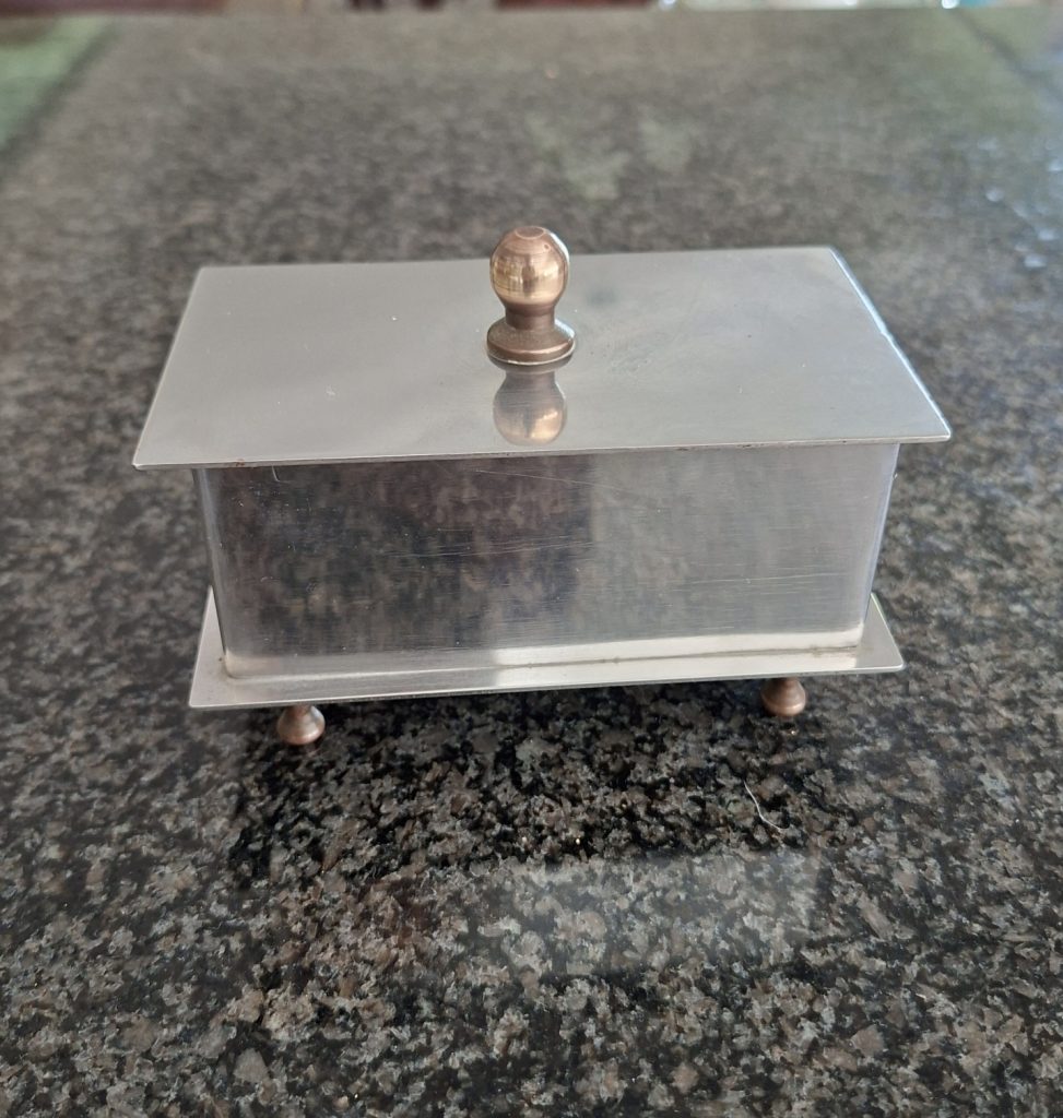 Interesting little lined trinket box appears to be stainless steel – the legs and knob are turned brass. Looks one of a kind. Please look at the pictures and dont hesitate to ask any questions.