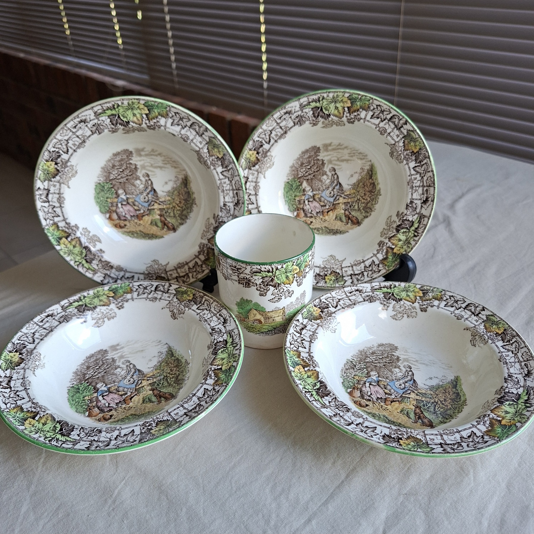 4 Bowls in good used condition  some light scratches to the bottom of the bowls.   The jar has stains inside the bottom and underneath.  Dont hesitate to ask any questions if you are not sure.