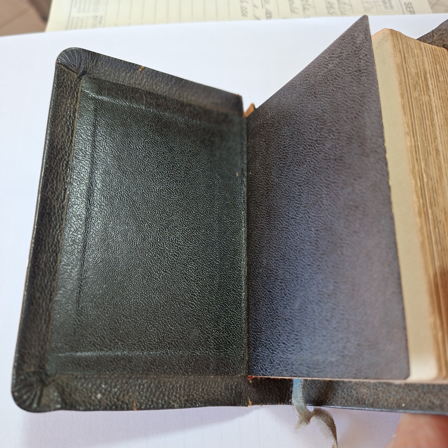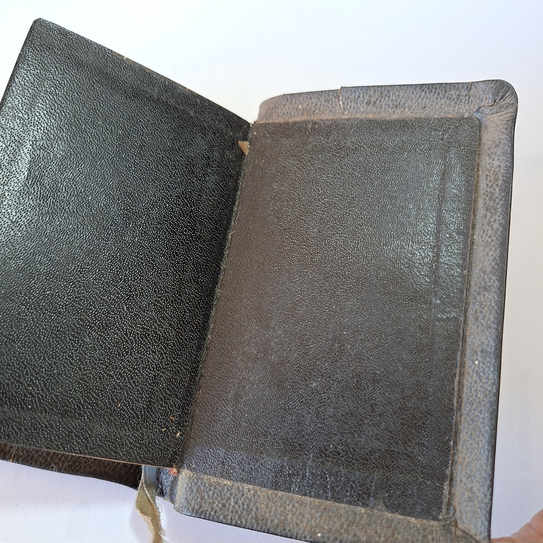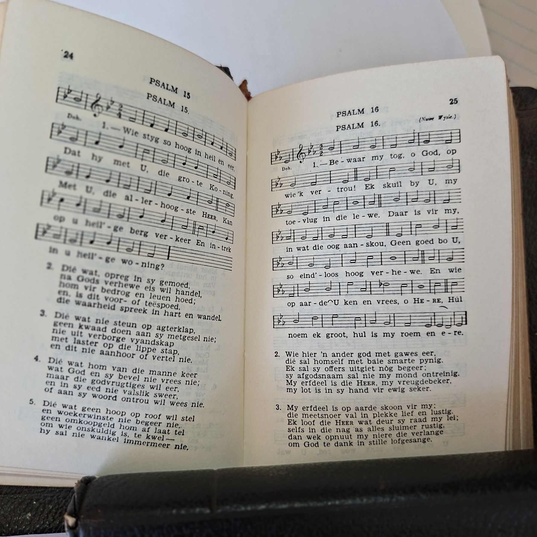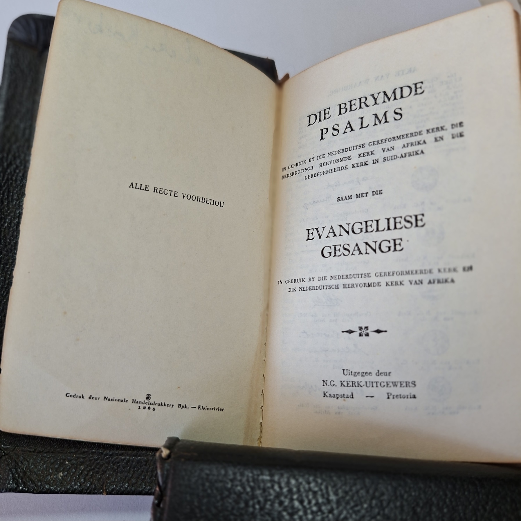 Afrikaans Psalms and Song book. Leather cover in good condition. Some bumps to the spine top and bottom. The book is in good clean preowned condition. Previous owners notes and names inside. A compact book. Please look at the images as they form part of my description.