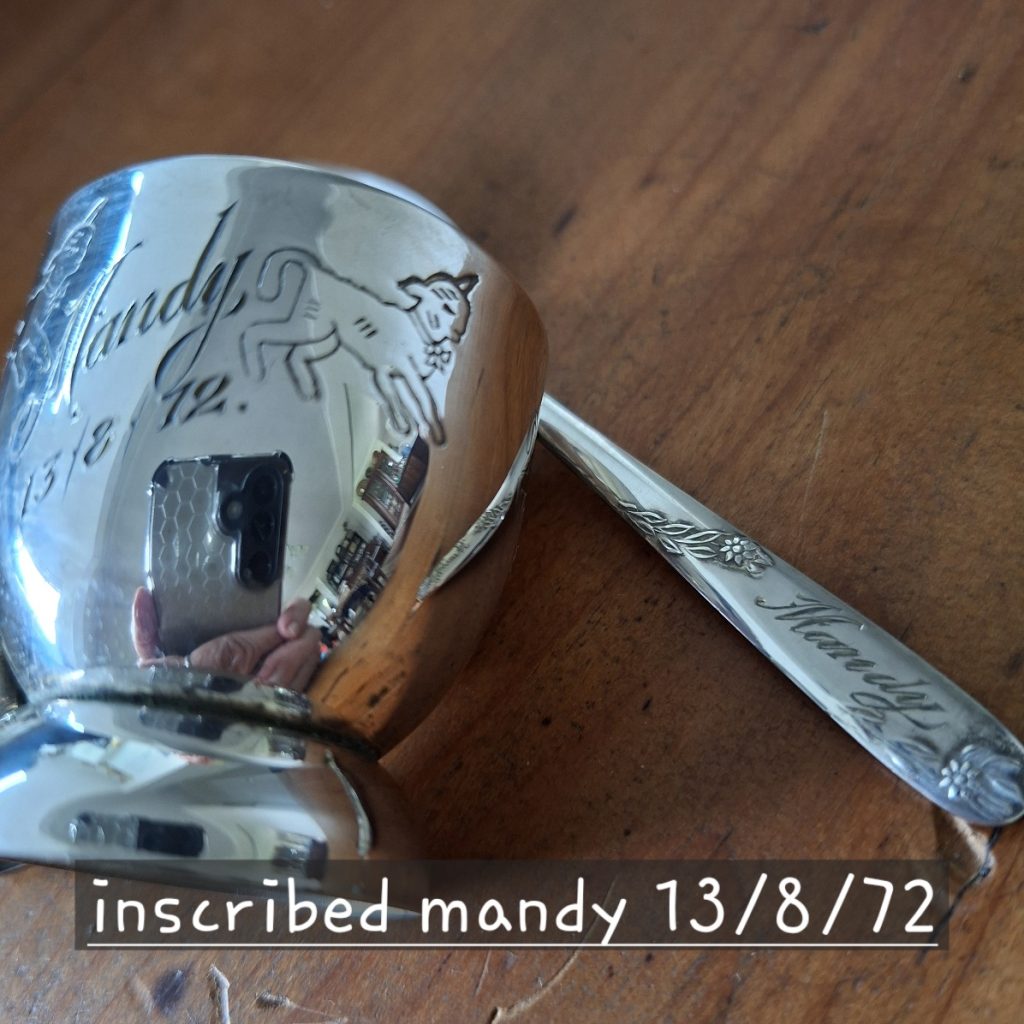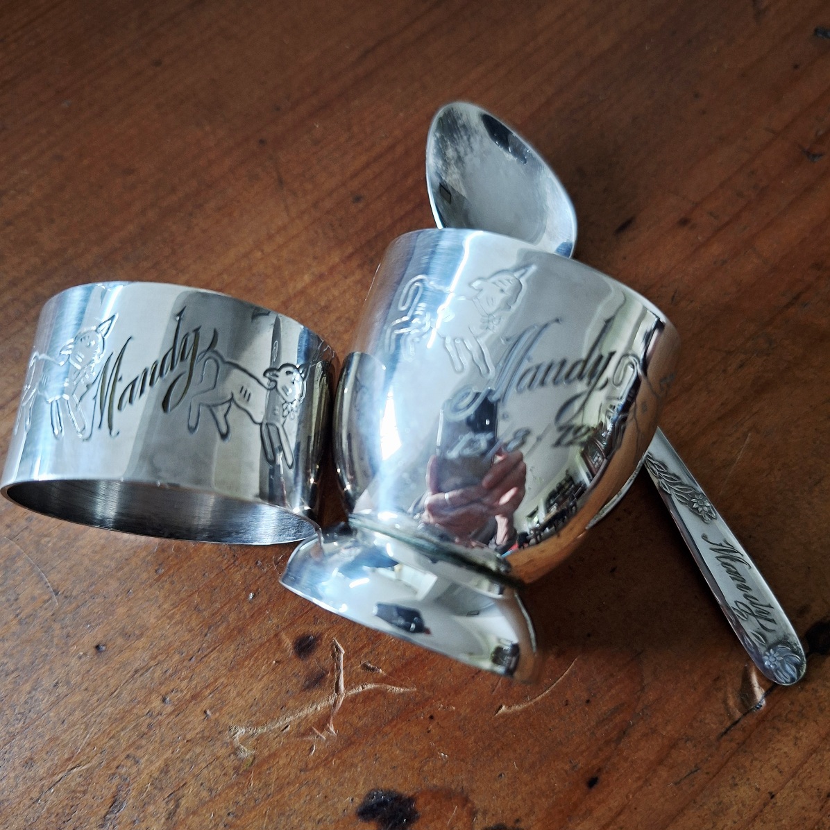 Angora silver Plate childs christening set, plus extra serviette ring.  Doesnt appear to have been used. The items are engraved with “mandy” 13/8/72.  43 yrs ago! This would be amazing to be recycled in our day and age to another special little child with their new date on it.    The extra serviette ring has a poodle on it.   No engraving. The box is sturdy but has some bumps and foxing on the lining.  Dont hesitate to ask any questions.