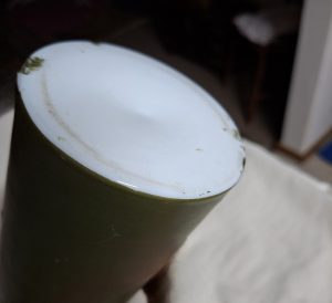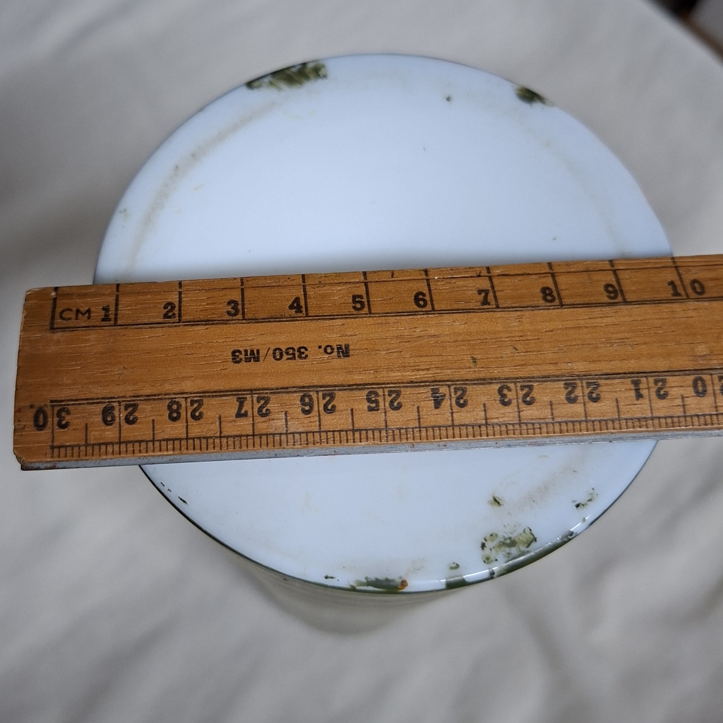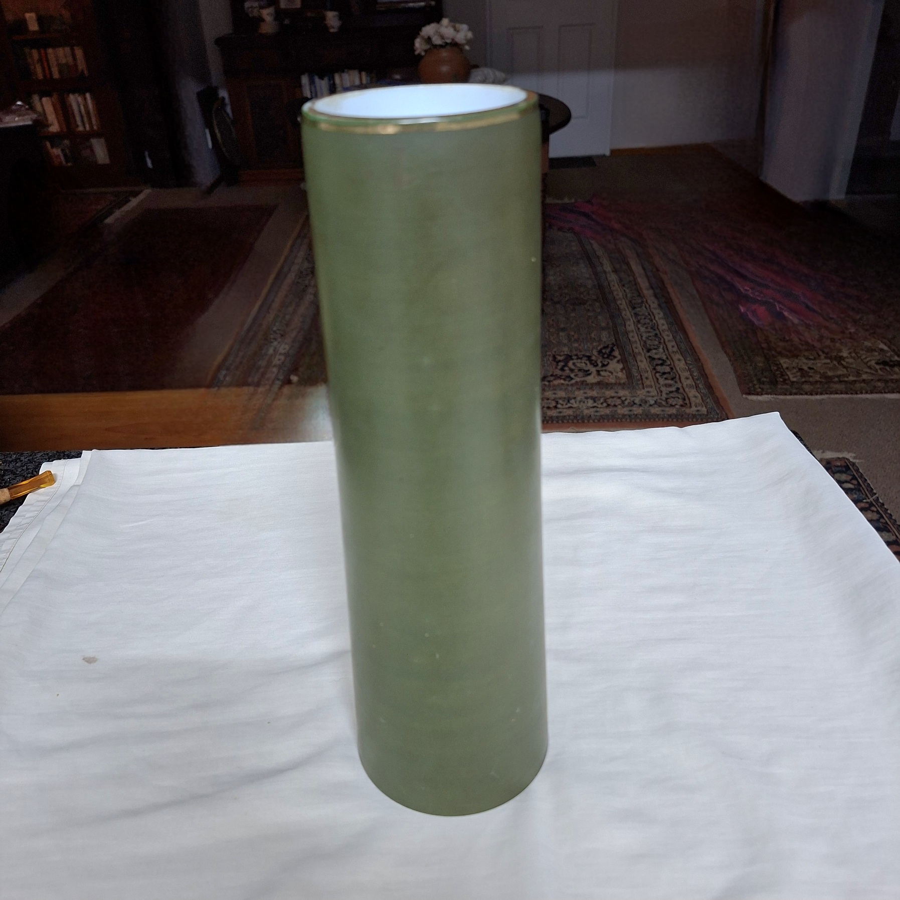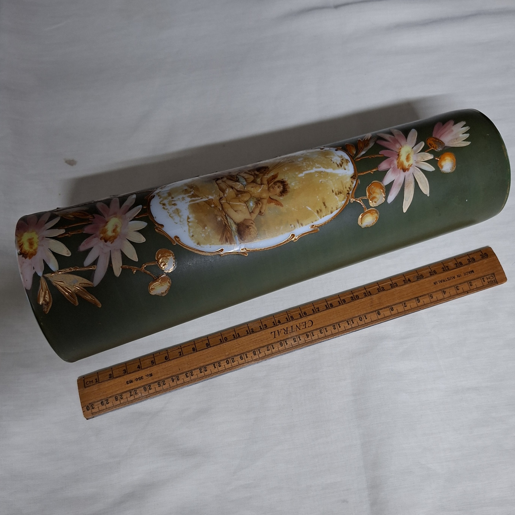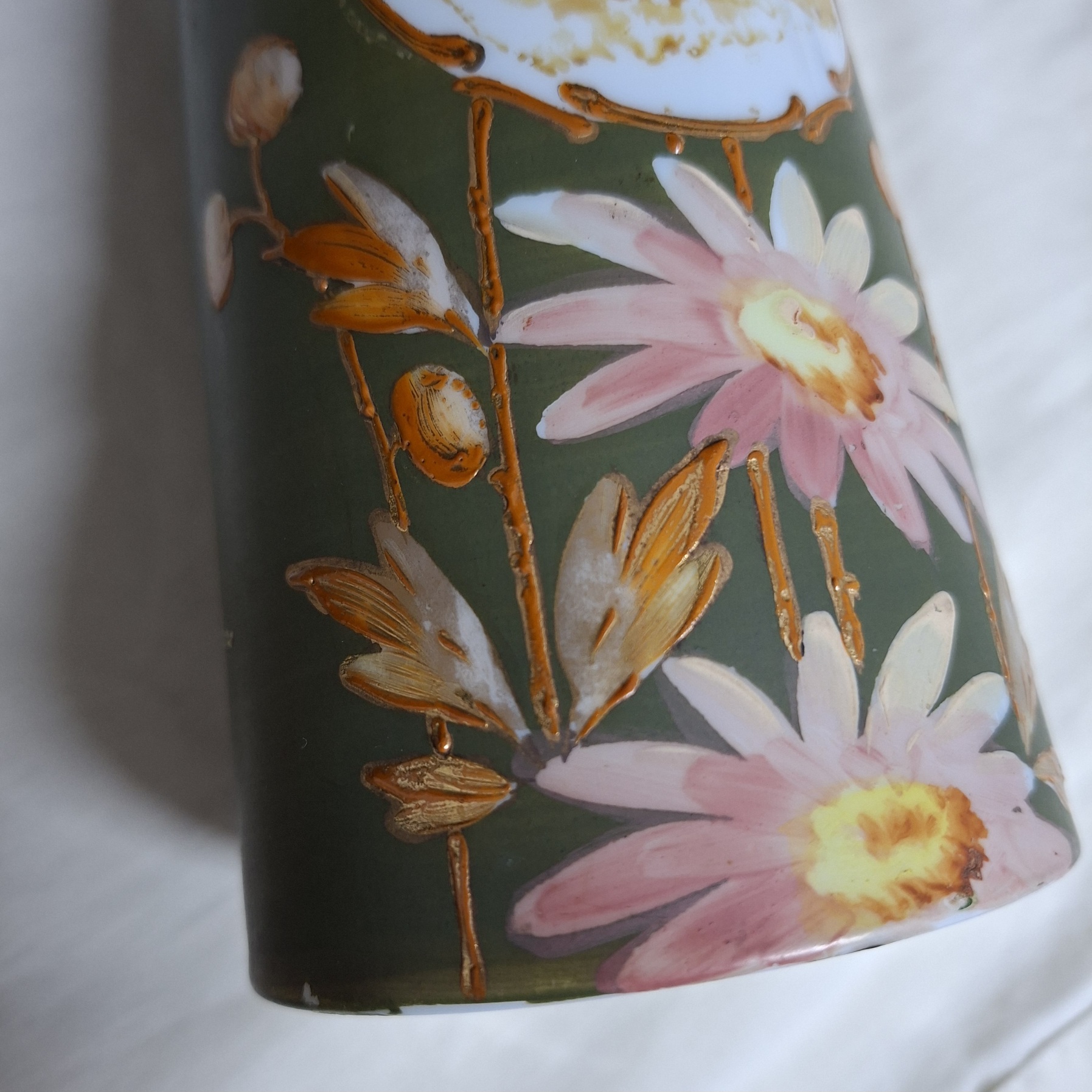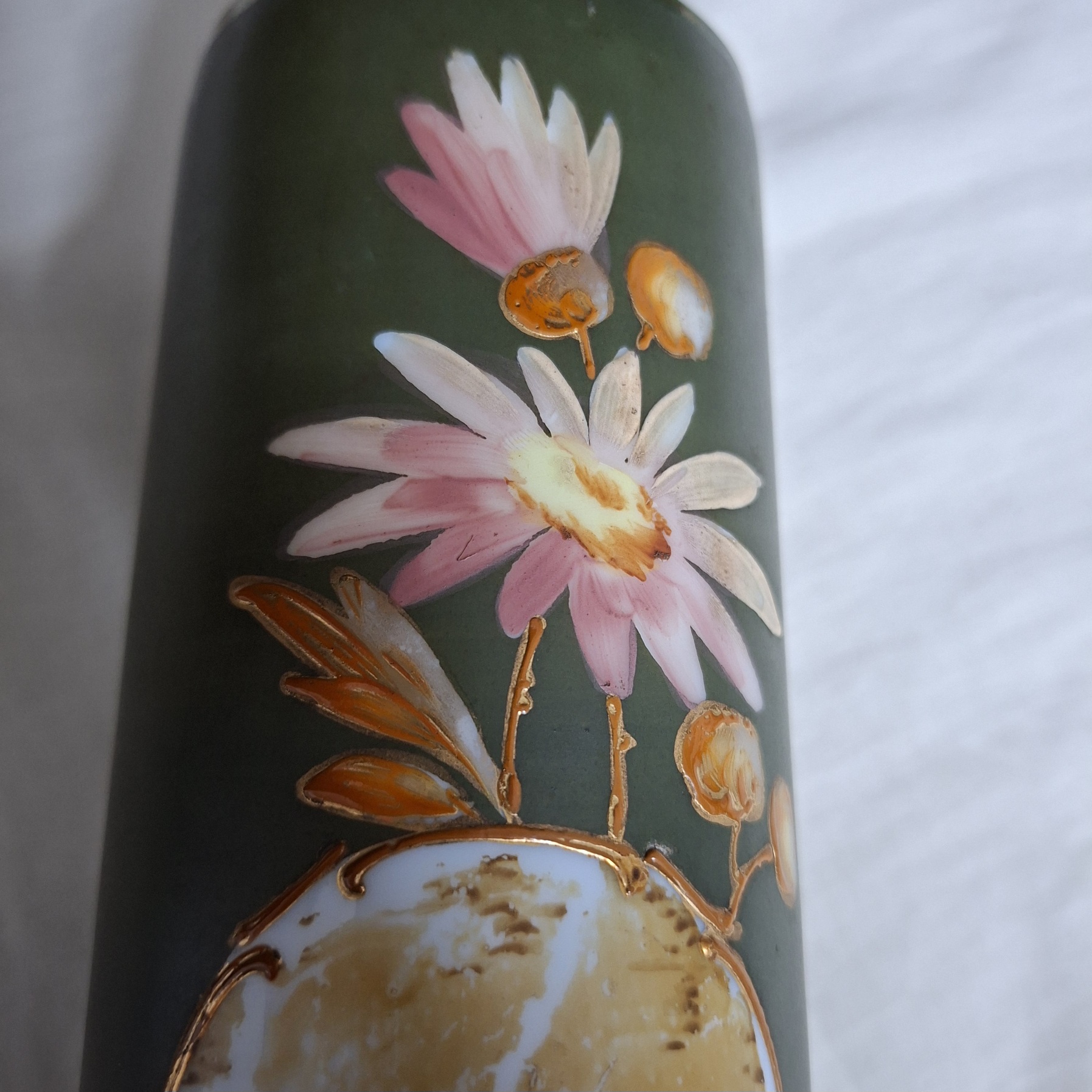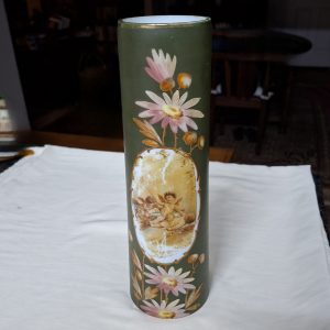 Such a lovely example of a victorian? vase – enamel, paint and transfer work on opaque milky glass. The body of the vase is satin olive green. A slight pontil mark on the base? The central transfer of cherubs has been scratched (see image). Some wear to the gold rim at the top. No chips or cracks noted. Apart from the scrateches on the transfer, in really nice used antique condition. Questions welcome. Please look at the picatures carefully.