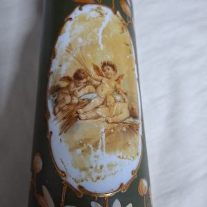 Be the first to review “Art glass – painted enamelled opaque opaline milky glass vase. Cherubs and Gilded enamelled work” Cancel reply