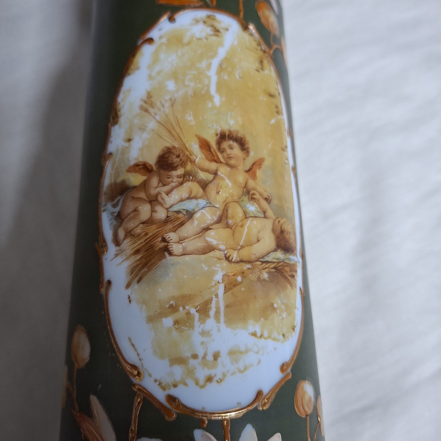 Art glass – painted enamelled opaque opaline milky glass vase. Cherubs and Gilded enamelled work