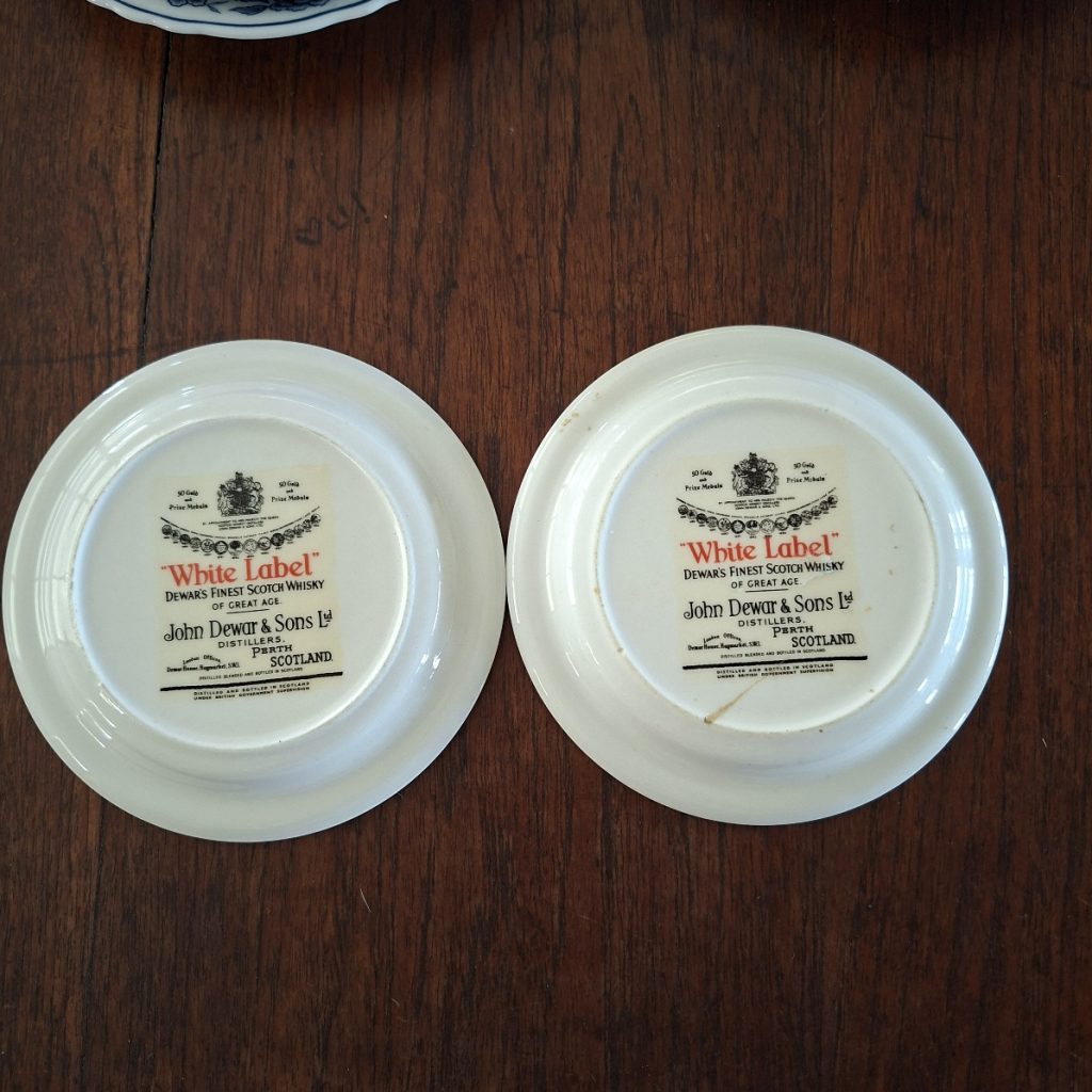 Two barware advertising trinket dishes. Dewars White Label Whisky. The dishes are in used vintage condition with loss of gilding around the edges. No chips or cracks.