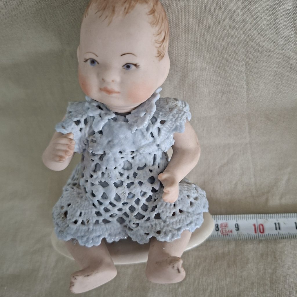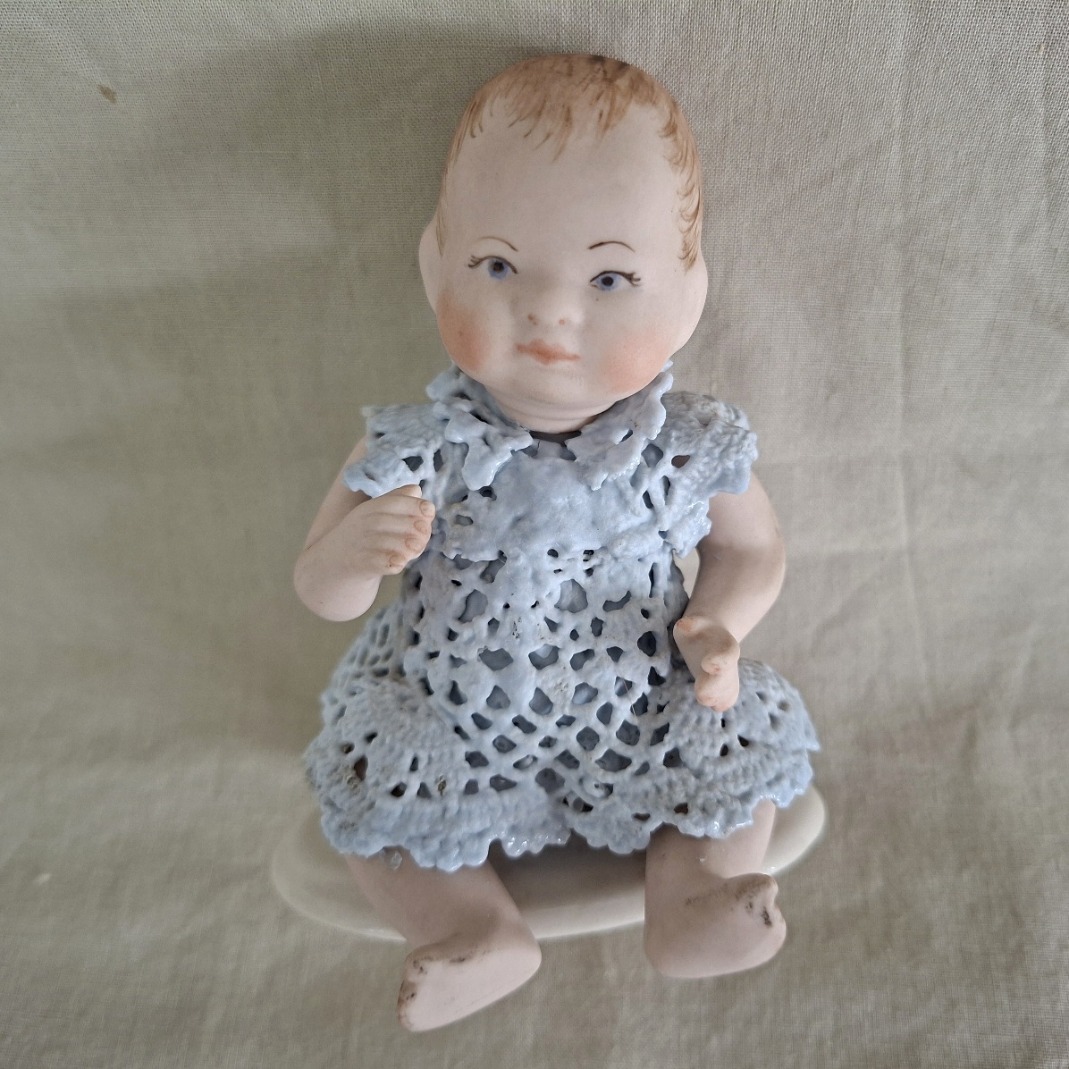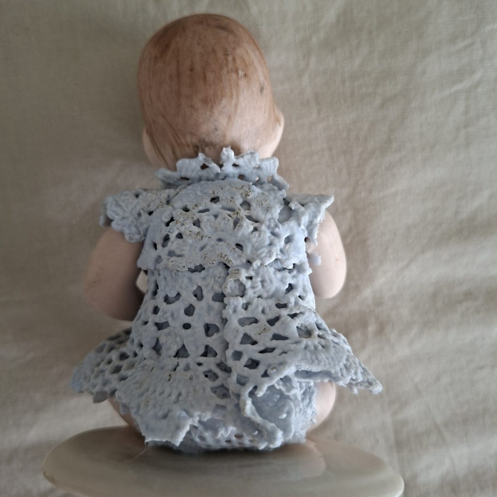Porcelain bisque doll with porcelain bisque dress. The doll has a painted face and hair. No chips on the body hands or face. She is sitting (attached to an oval plinth) If you look at the pictures you will see a couple of areas on one shoulder and behind on the dress hem where one or two areas of the lace dress have chipped. She is wearing blue lace panties. Dont hesitate to ask any questions.