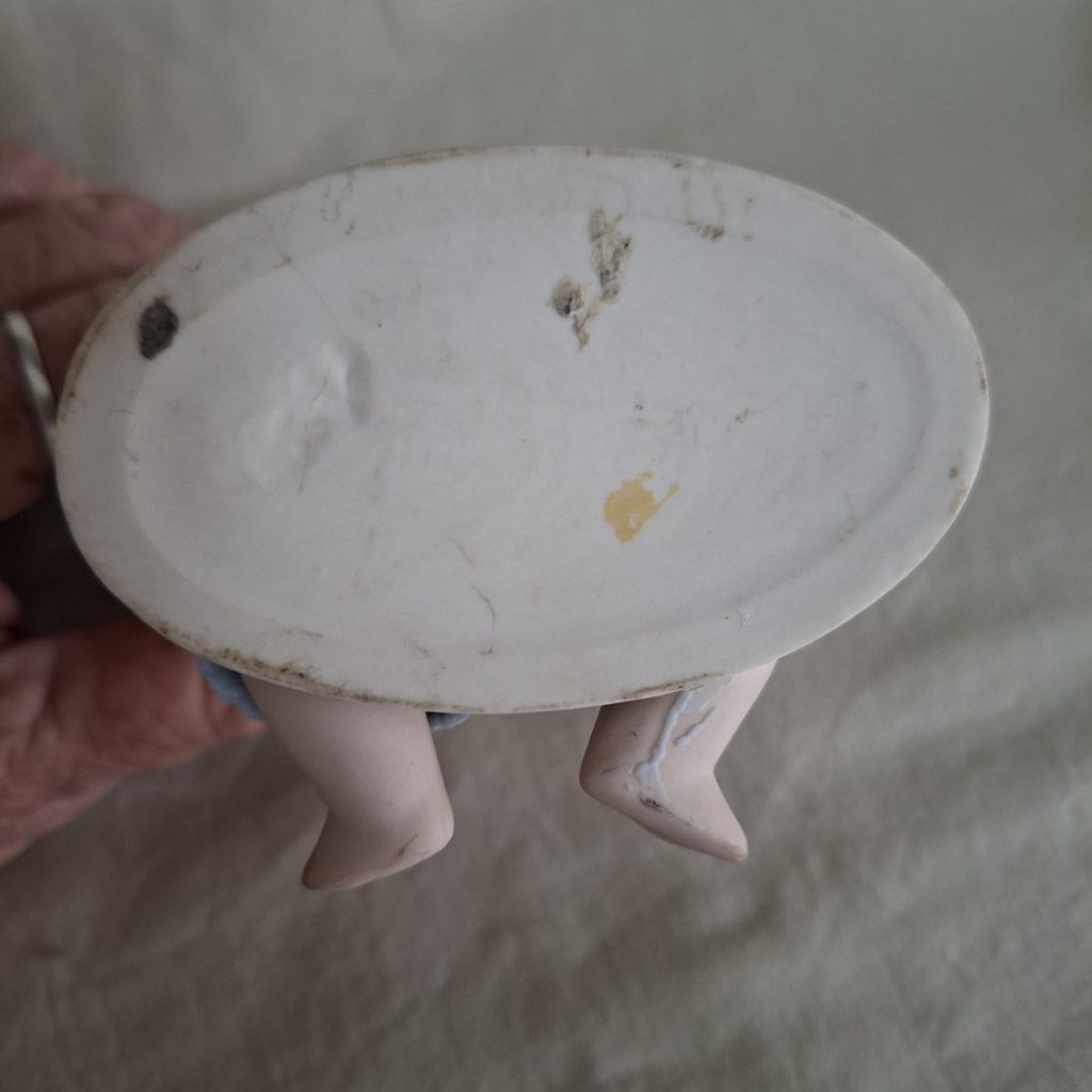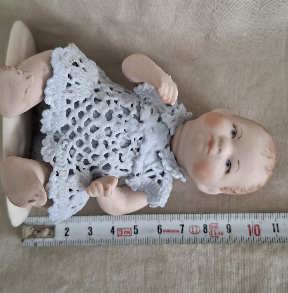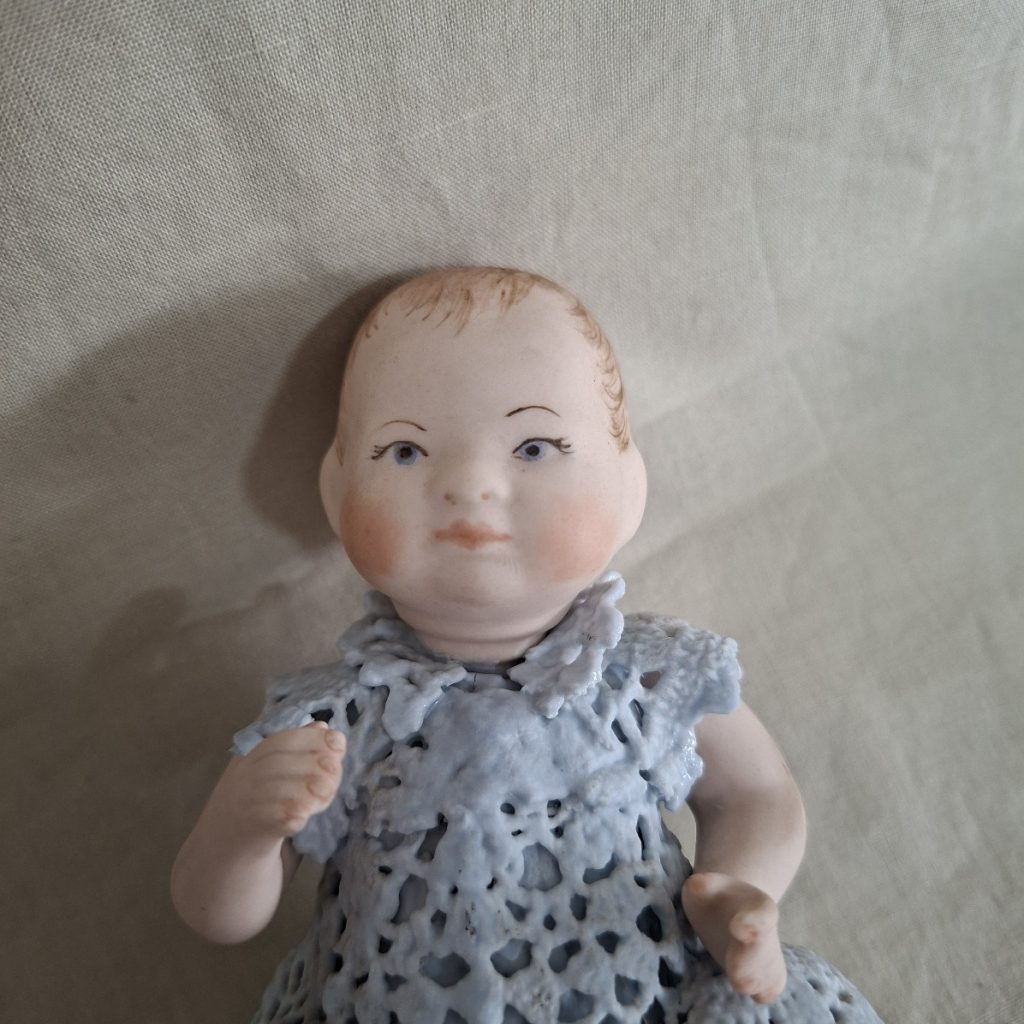 Porcelain bisque doll with porcelain bisque dress. The doll has a painted face and hair. No chips on the body hands or face. She is sitting (attached to an oval plinth) If you look at the pictures you will see a couple of areas on one shoulder and behind on the dress hem where one or two areas of the lace dress have chipped. She is wearing blue lace panties. Dont hesitate to ask any questions.