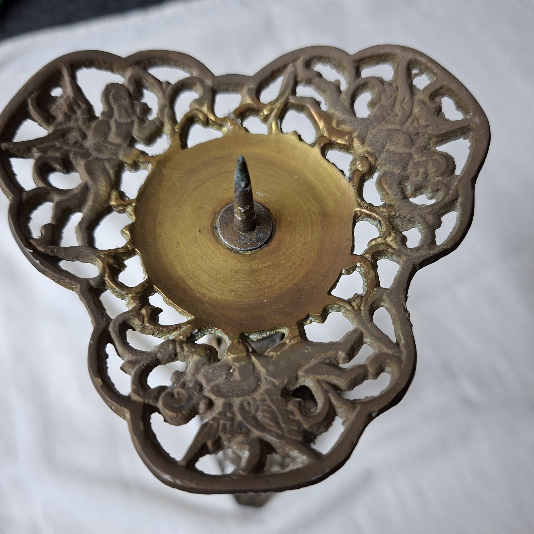 Vintage brass candlestick. In good used vintage condition. Filigree angels and dragons? around the candlestick. Lovely item stands firmly. Please look at the pictures and dont hesitate to ask any questions.