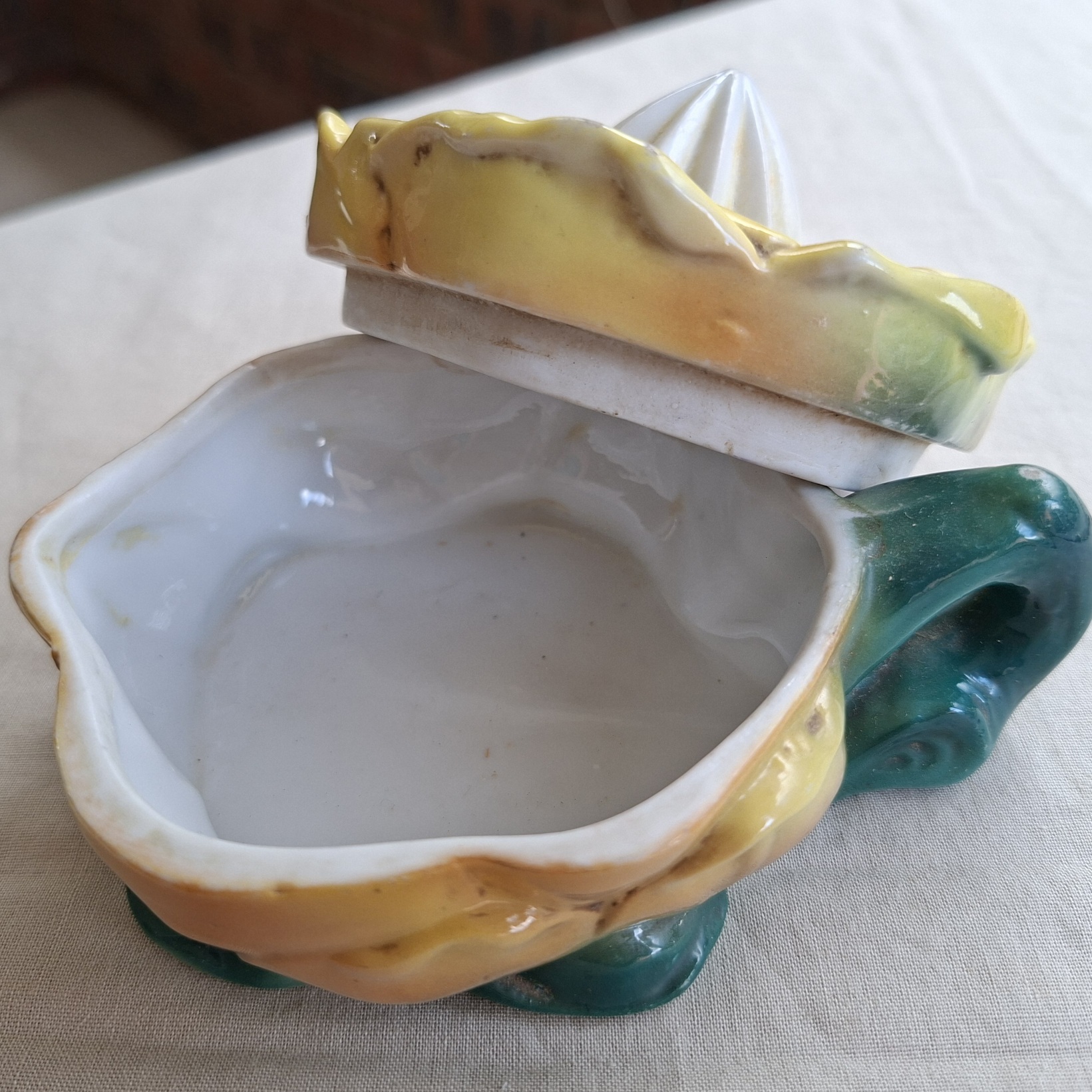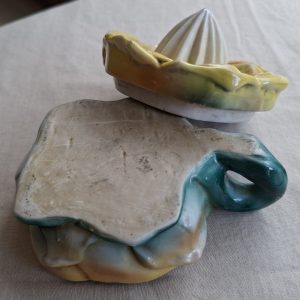 Flower shaped juicer. No chips or cracks. Needs a wash as its “as found”, also needs a good wash. Fun item to add to a collection. Some of the ceramic glaze around the top edge is worn. A little loss of glaze on the handle too. Please look at the pictures carefully and questions are welcome.