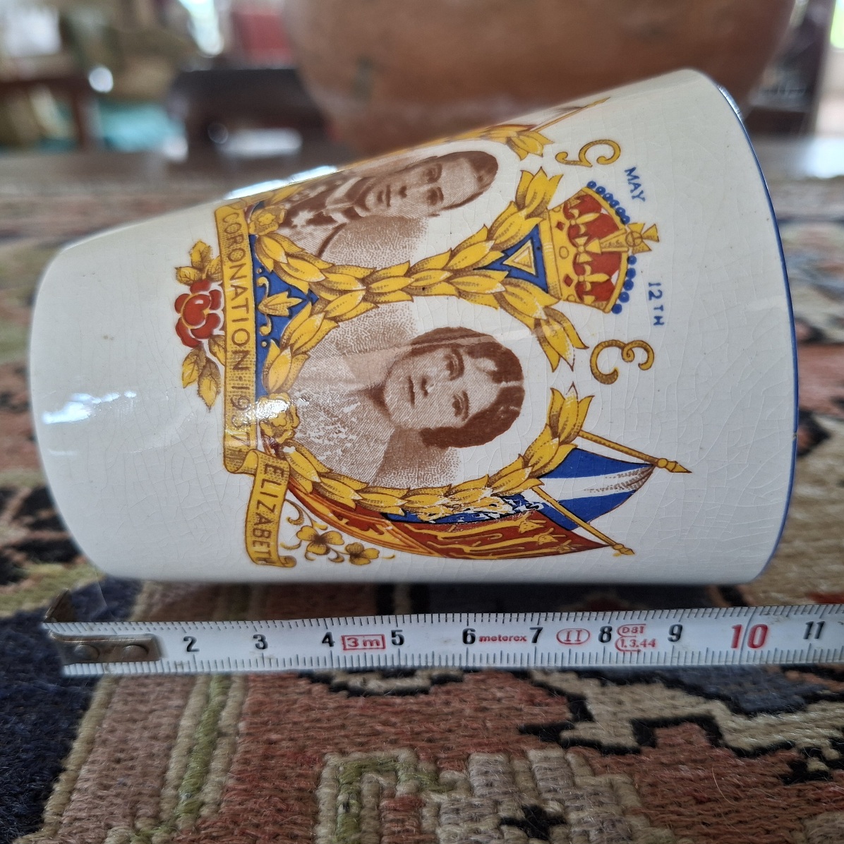 Royal Coronation Tumbler 1937 George V1 and Queen Elizabeth. May 12th 1937. A souvenir mug which has “Emperor of India King of the Dominions” on the reverse side of the mug. This tumbler has a fair amunt of crazing to the glaze. It is in used vntage condition. Please look at the pix carefully. Questions Welcome.
