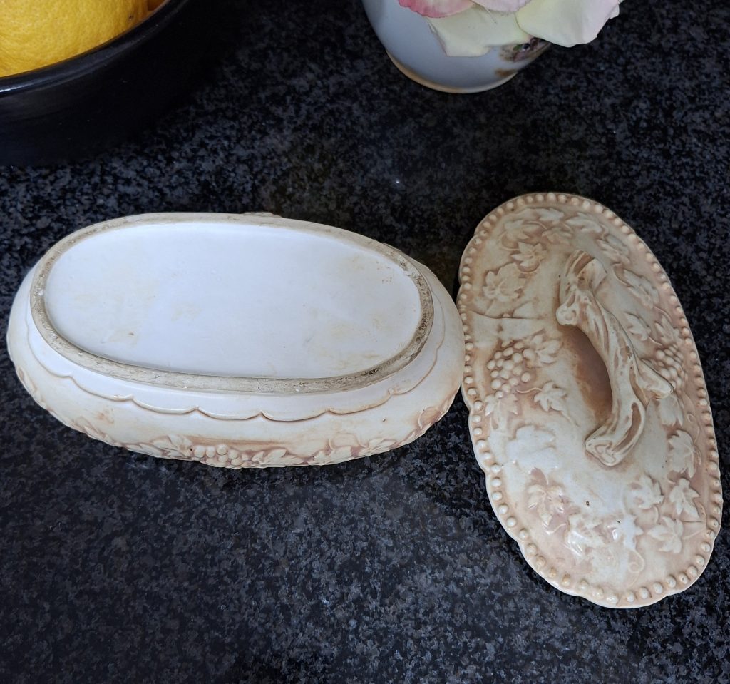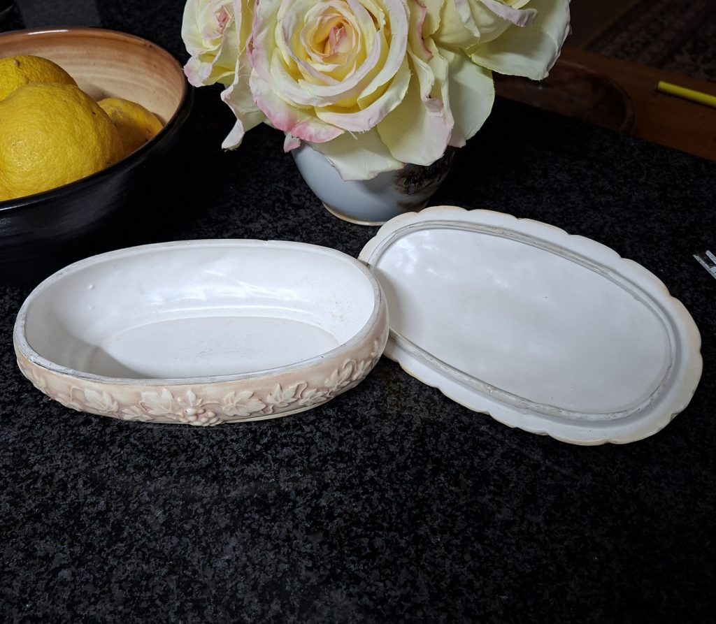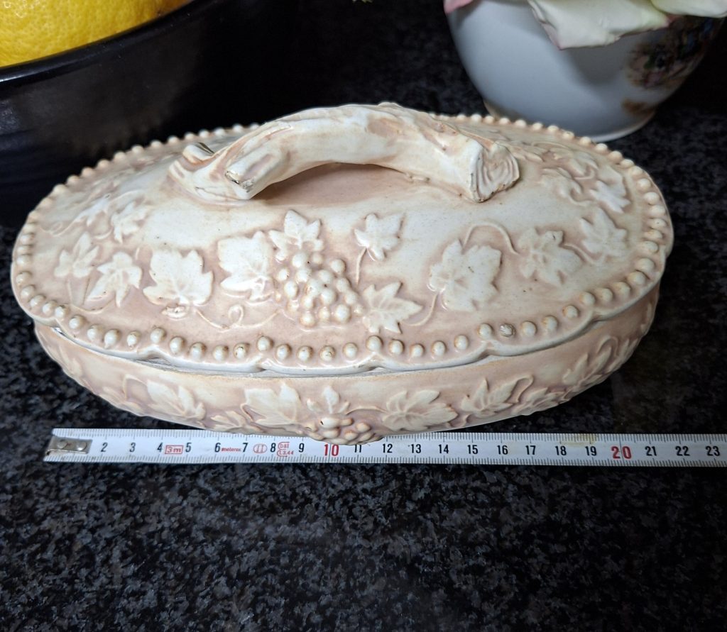 Ceramic embossed lidded bowl – design with grape twig handle. In used vintage condition. There is a rough imperfection around the rim of the bowl and a very small chip in the same area. This is not a fine porcelain, nonetheless, its a pretty decortive piece.