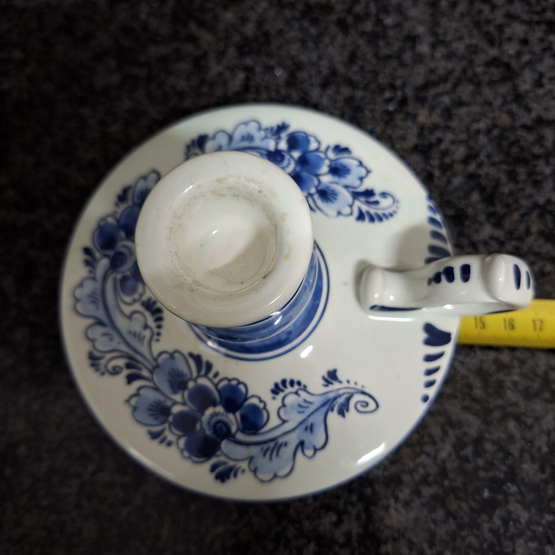 Blue and white delft hand painted porcelain candle stick. In good used vintage condition. 15cms x 9 cms The factory omitted to stamp this item on manufacture which sometimes happens. Please look at pictures carefully and dont hesitte to ask any questions.