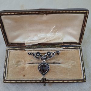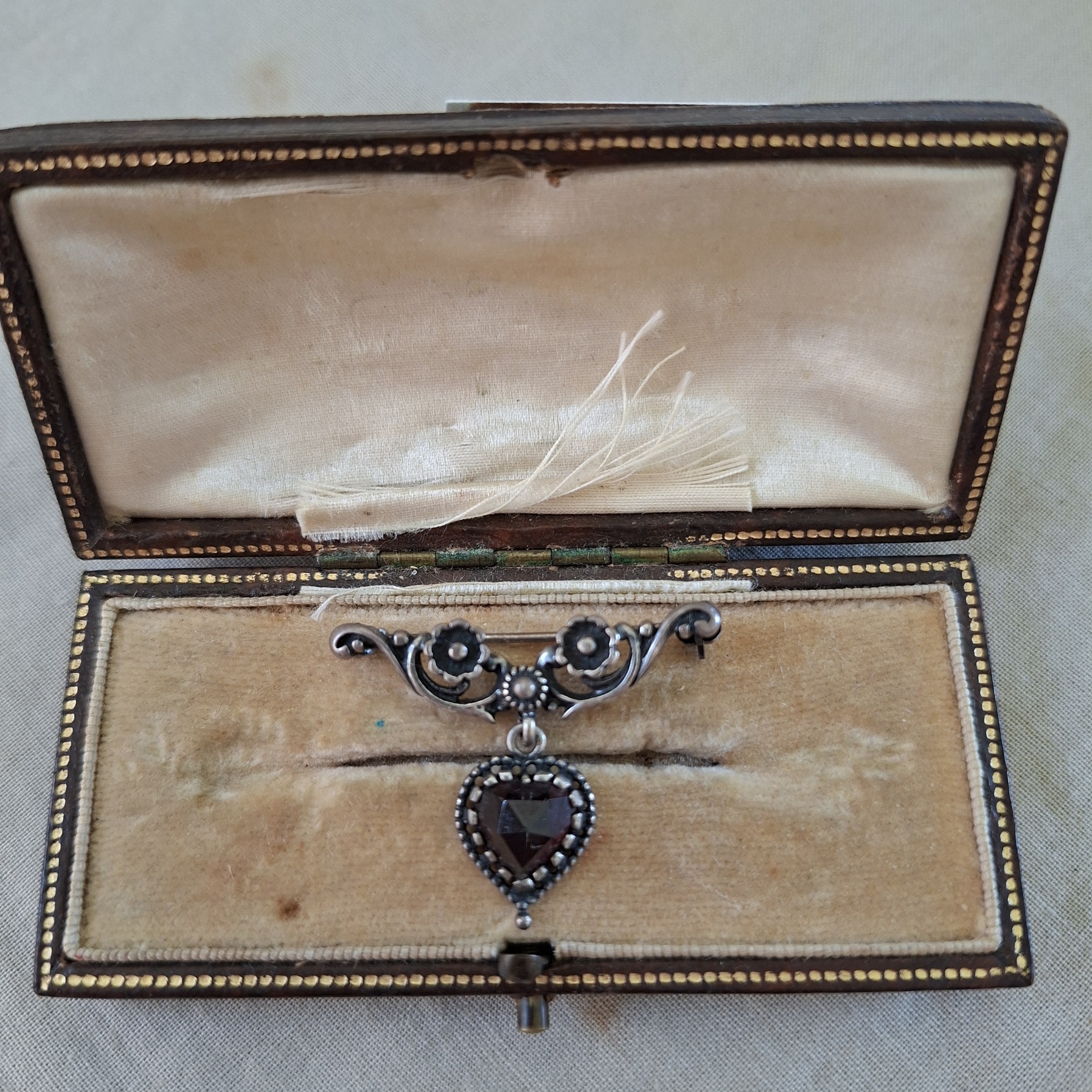 A very pretty brooch in a old leather covered jewelry pin box (not in original box)  The heart with the possibly faceted garnet is 835 silver and the piece with the pin stamped 925.    A lovely piece of vintage/antique jewelry.  3.5 cms x 2.5.  Roll over clasp.  In good overall condition.