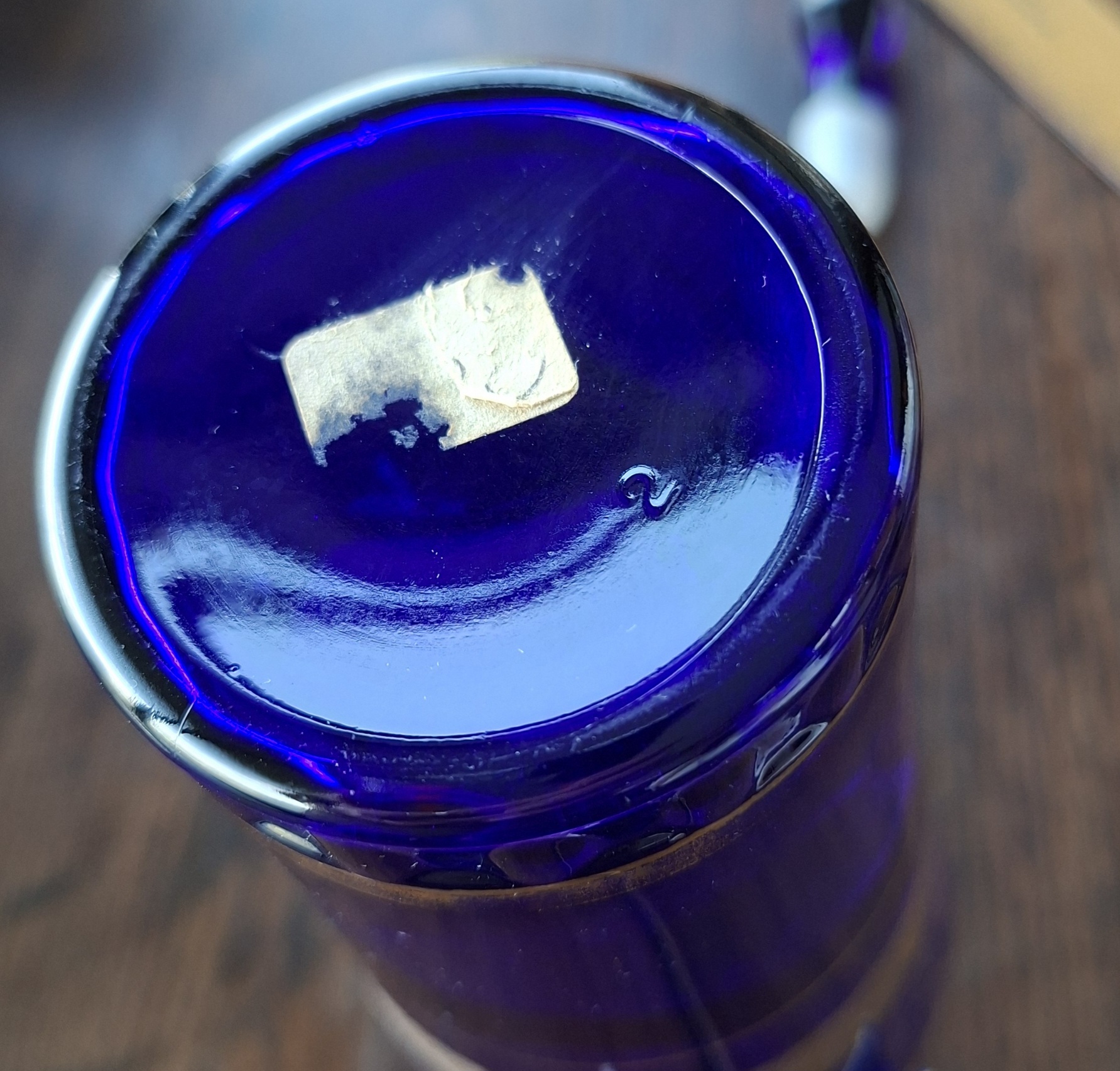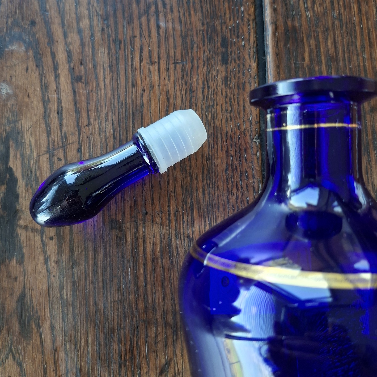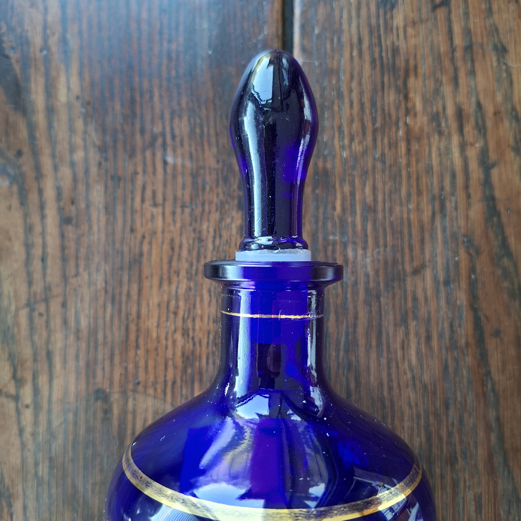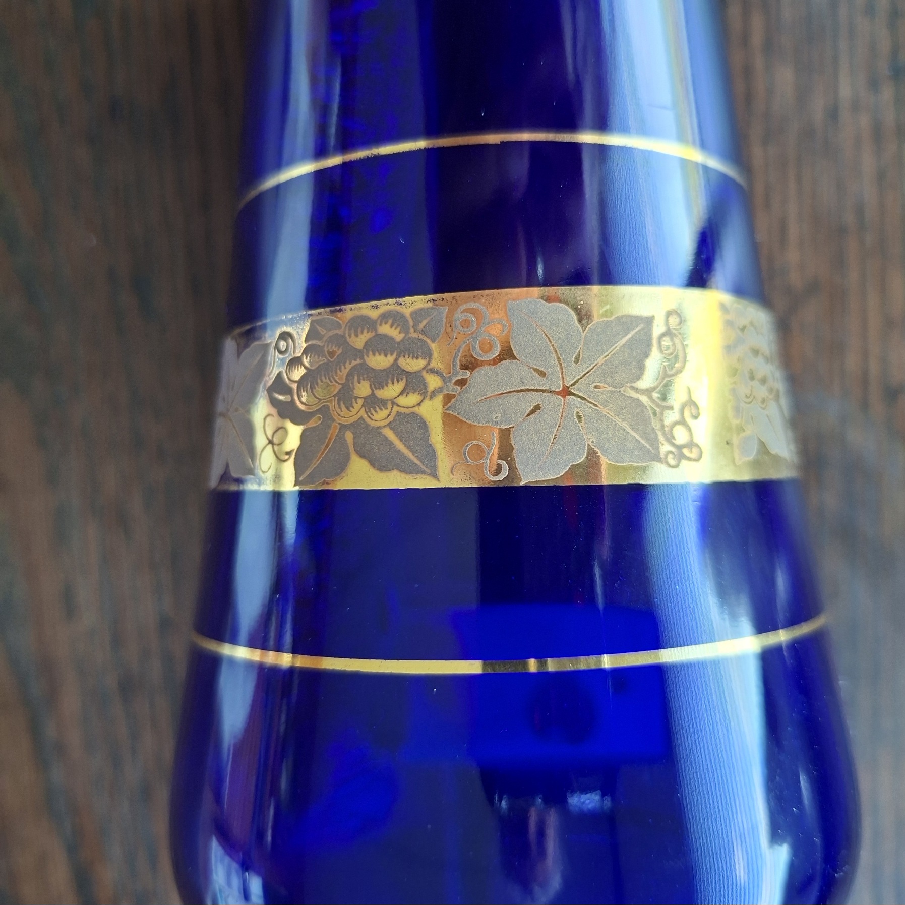 A pretty cobalt blue bottle decanter bottle with a band of grape vine design in gold. No chips or cracks noted. Gilding is a little worn in places. Dont hesitate to ask any questions.