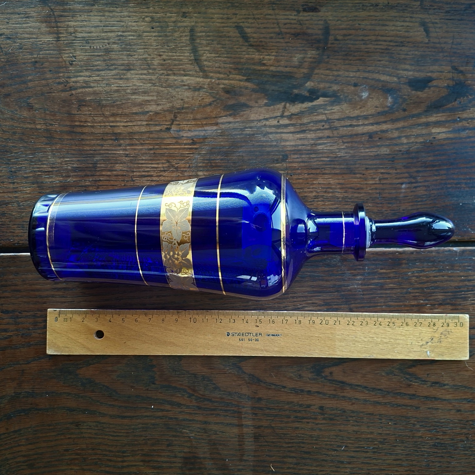 Glass bottle Decanter Cobalt Blue with gold grape vine design -28 cms tall – italian?