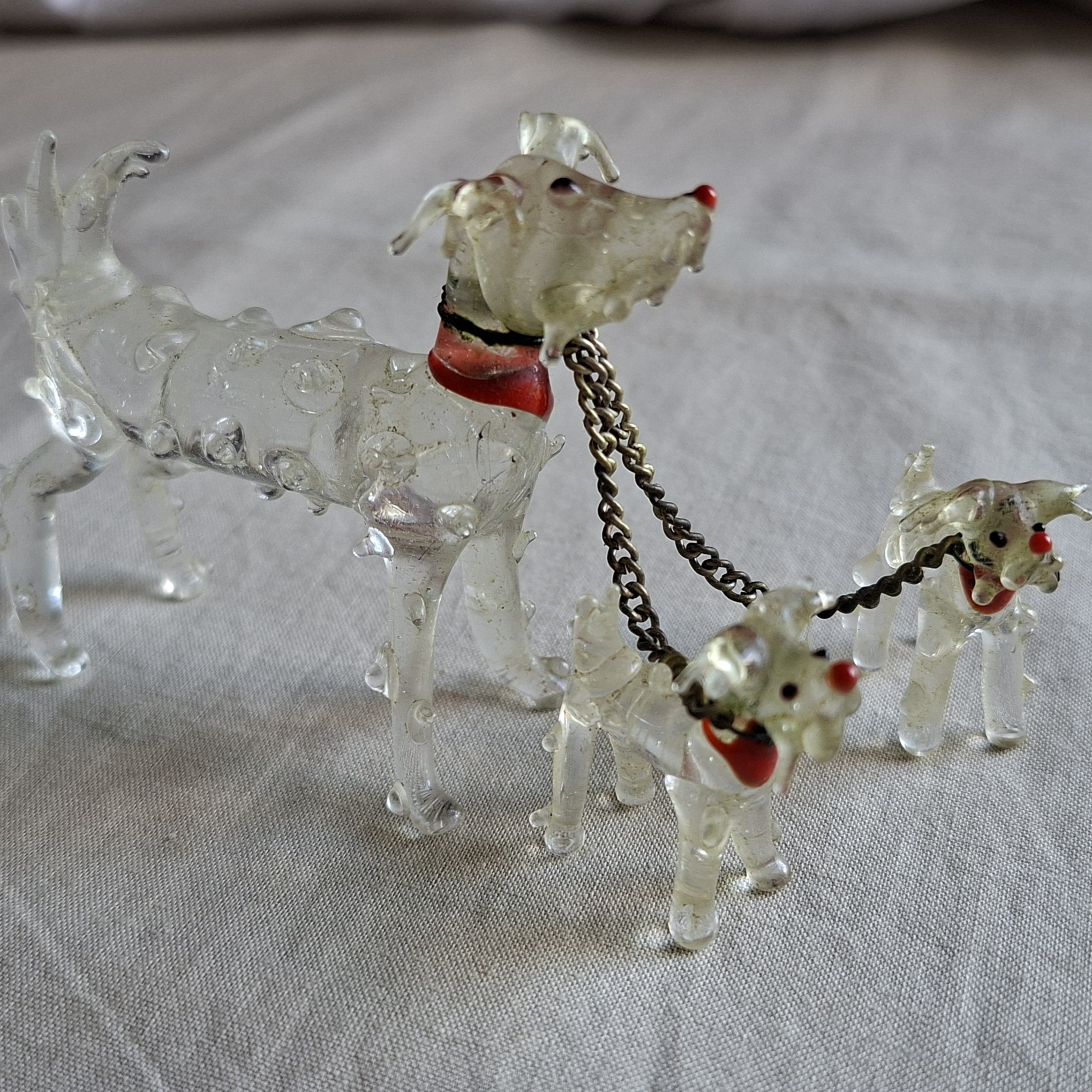 Glass dog and 2 pups red collars and noses. Vintage scruffy dog