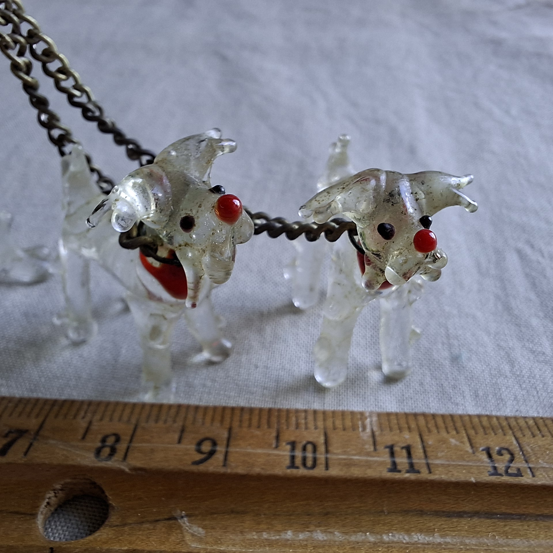 Vintage dog and two pups ornament. Pups are joined by silver metal chains. Please note I have not washed them. They have the dust of ages on them. Lovely vintage hand made glass items. No chips or breaks. Dont hesitate to ask any questions.