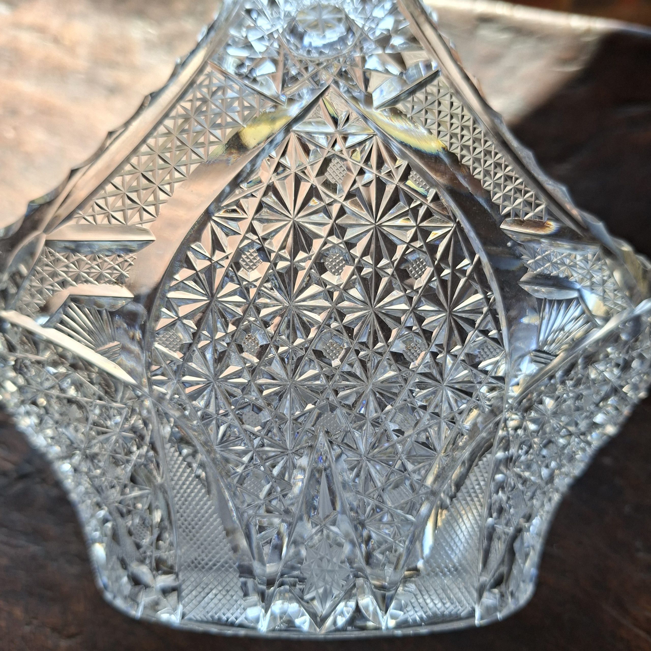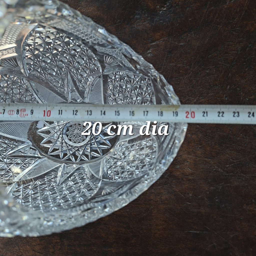 Superb large heavy, hand cut lead crystal basket.   No damage.  Reflects light superbly.  Its 20cms from base to top of handle and 20cms wide.  Dont hesitate to ask any questions.