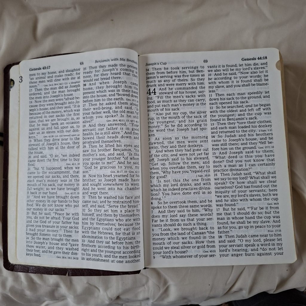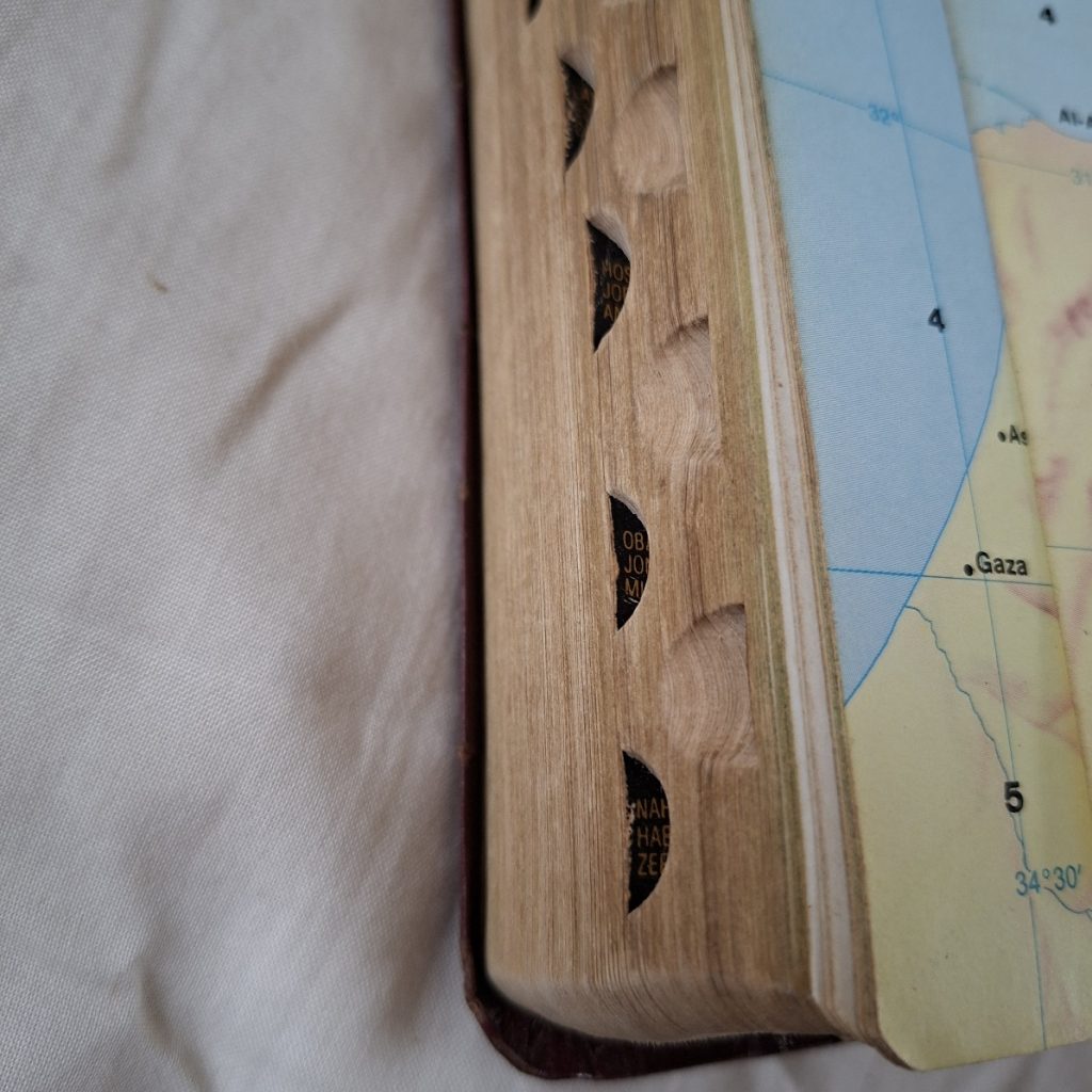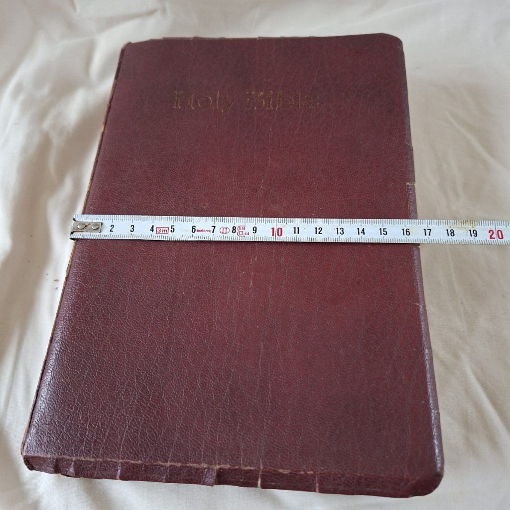This is a new King James version.  Large Print.   The cover i a type of leatherette and is torn along the edges. See pics.  There are tabs separating the chapters.  The first blank page has been removed as it had previous owners name and personal details.  Good clean tight copy.   Some pasages have been highlighted by previous people.   Words of Christ in red.   Some crimping to the bottom of a section of the pages.   Could have been damp?  Doesnt detract from the book.
