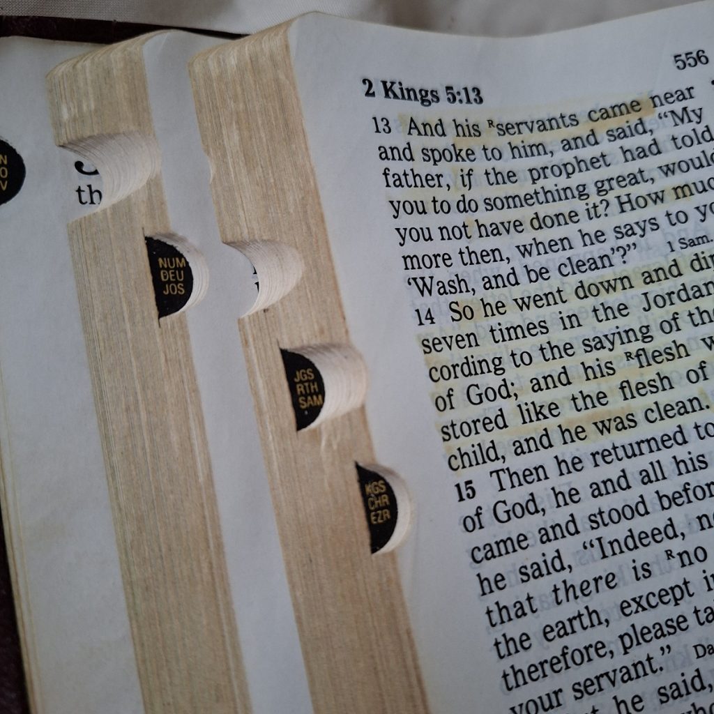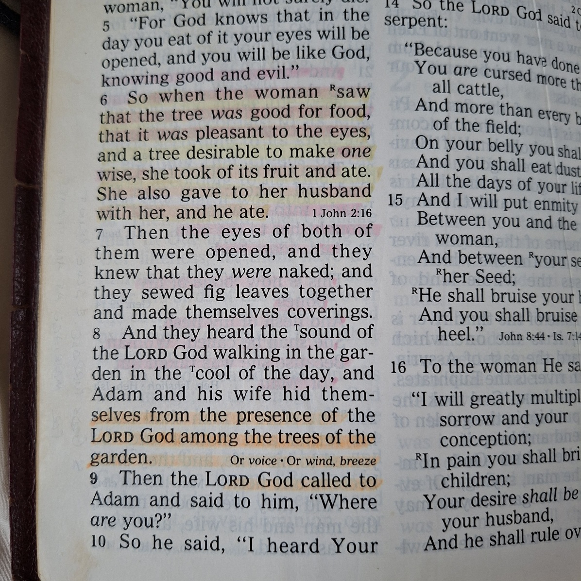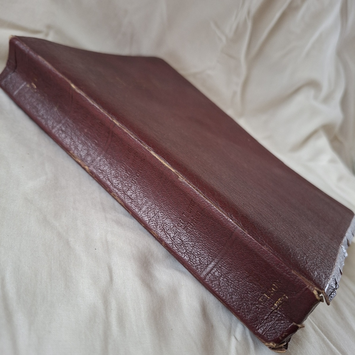 This is a new King James version.  Large Print.   The cover i a type of leatherette and is torn along the edges. See pics.  There are tabs separating the chapters.  The first blank page has been removed as it had previous owners name and personal details.  Good clean tight copy.   Some pasages have been highlighted by previous people.   Words of Christ in red.   Some crimping to the bottom of a section of the pages.   Could have been damp?  Doesnt detract from the book.