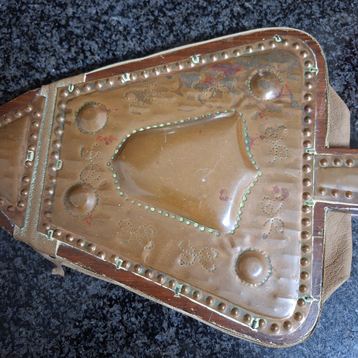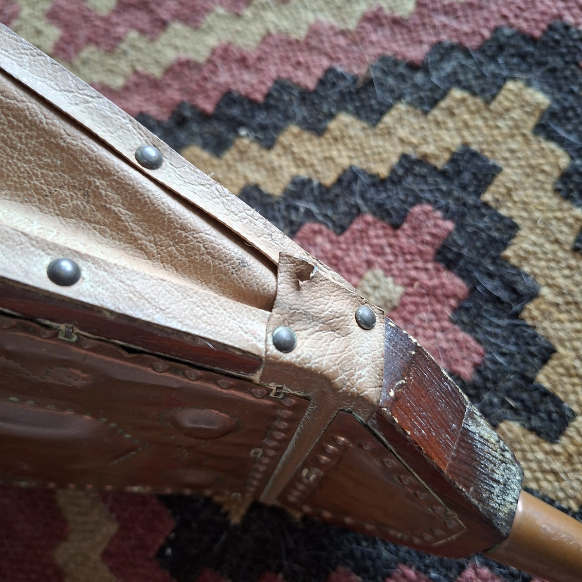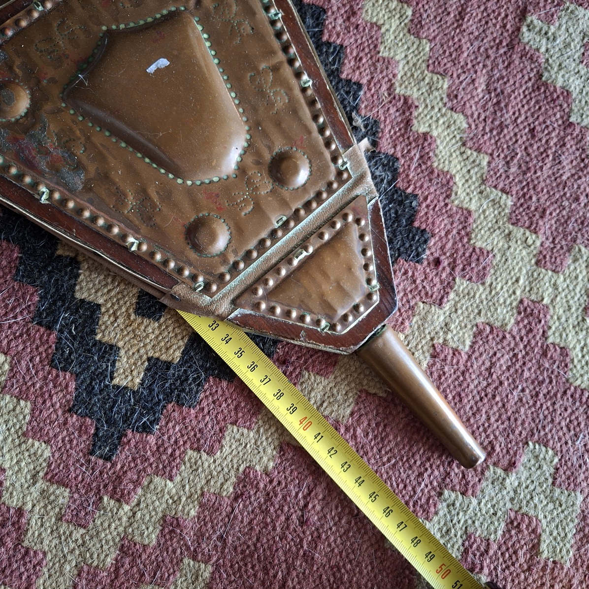 Leather and wood fire bellows.   Possibly swedish.   In usable vintage condition.   No holes noted in the leather bellows.  There is a small section of leather on the outside that has lifted.  Decorative copper design on the top.  The underside is quite scratched.  A lovely workable item.   Please look at the pictures carefully and dont hesitate to ask any questions.