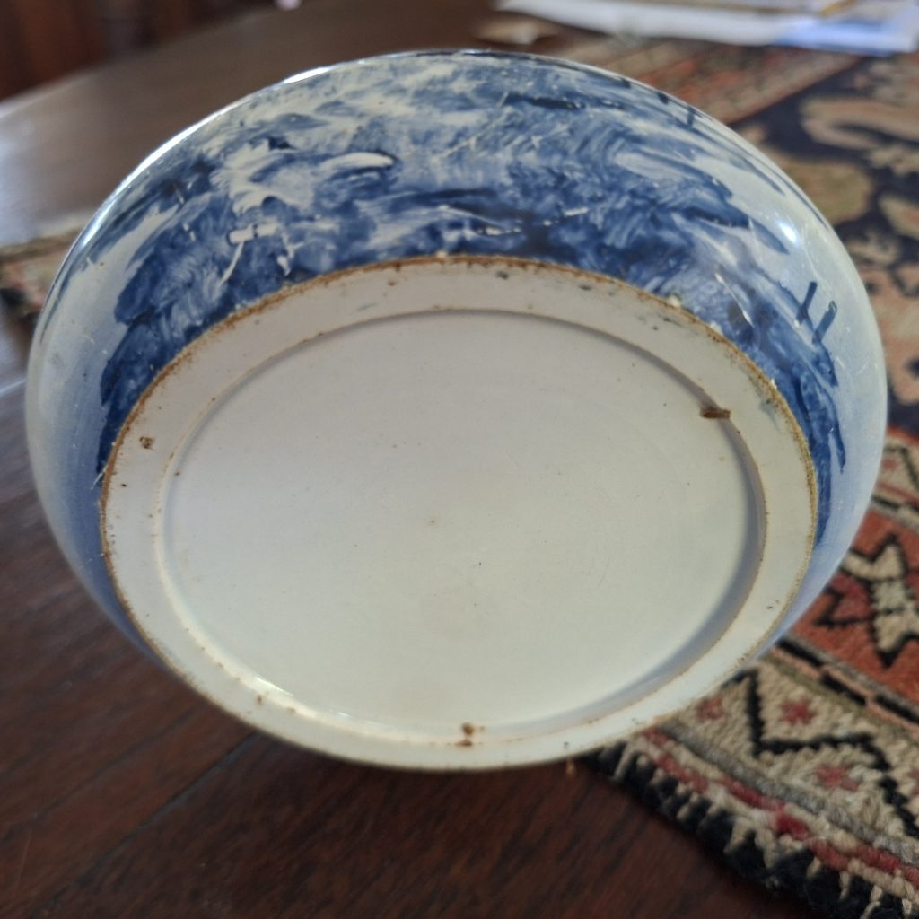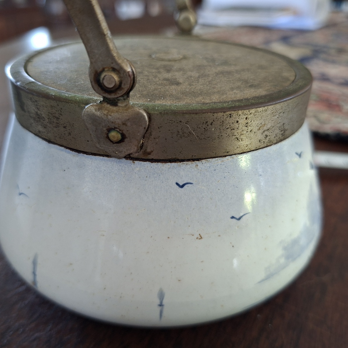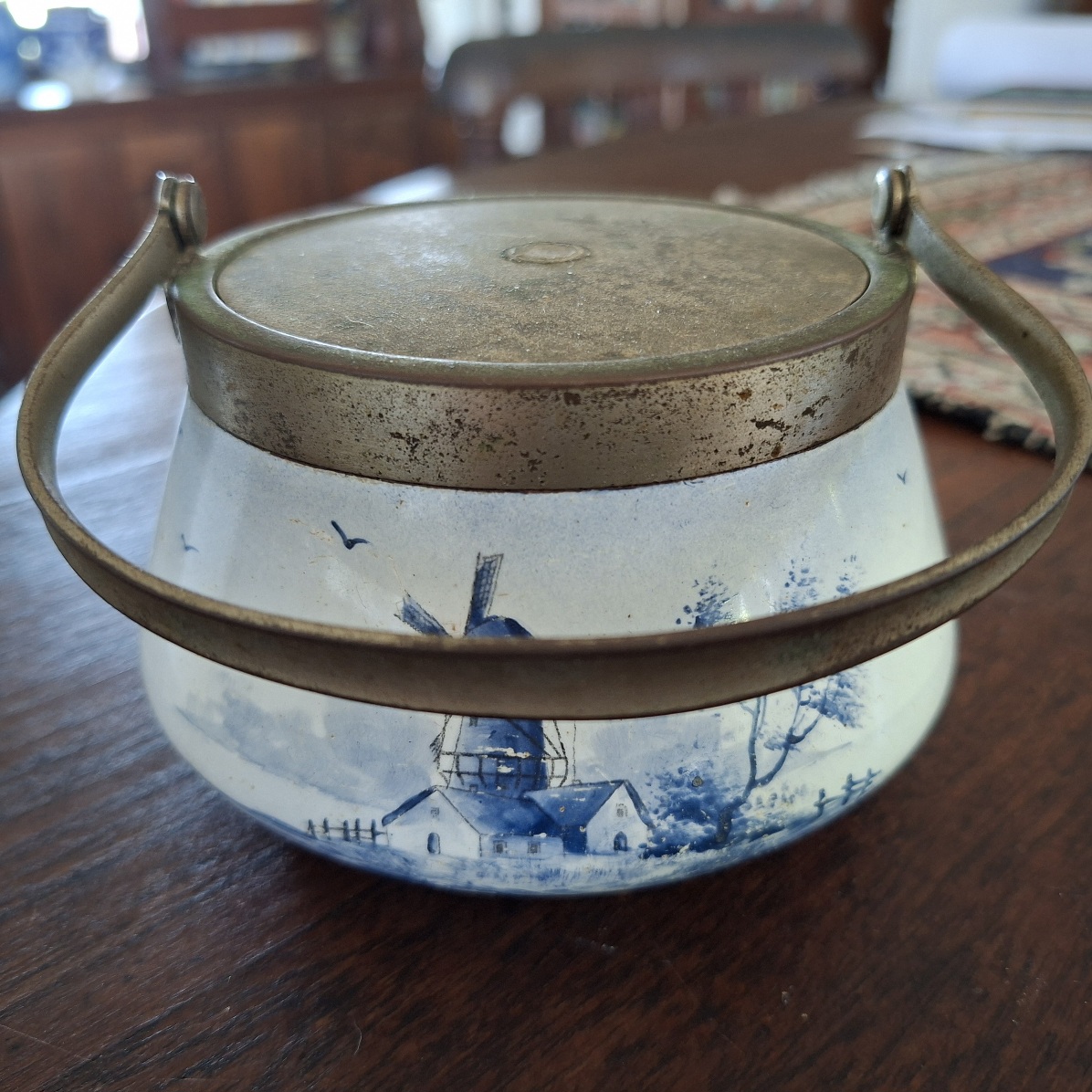 Old blue and white lidded jar. The knob is missing from the lid. It has a windmill and boats on blue tinted white background. No makers name. Swing handle. SP. Please look at the pix and dont hesitate to ask any questions. A very old piece.