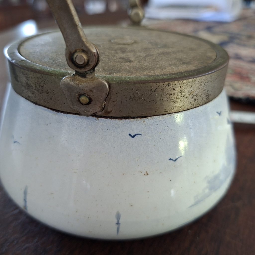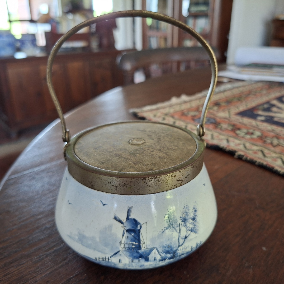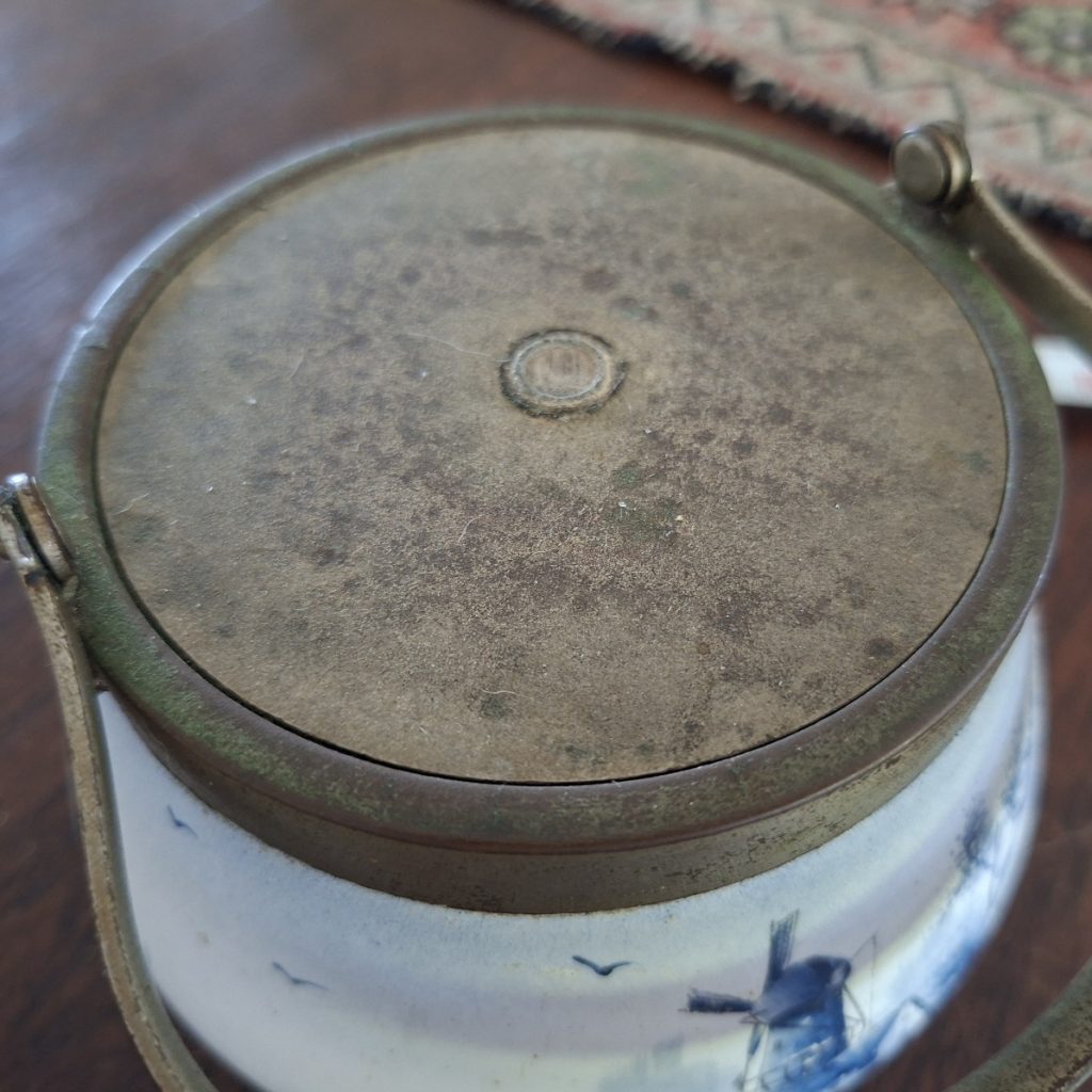 Lidded jar with Delft style hand painted windmill – vintage