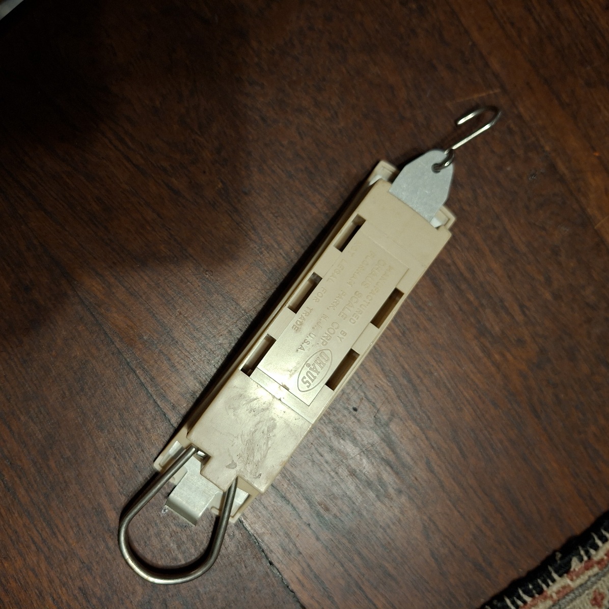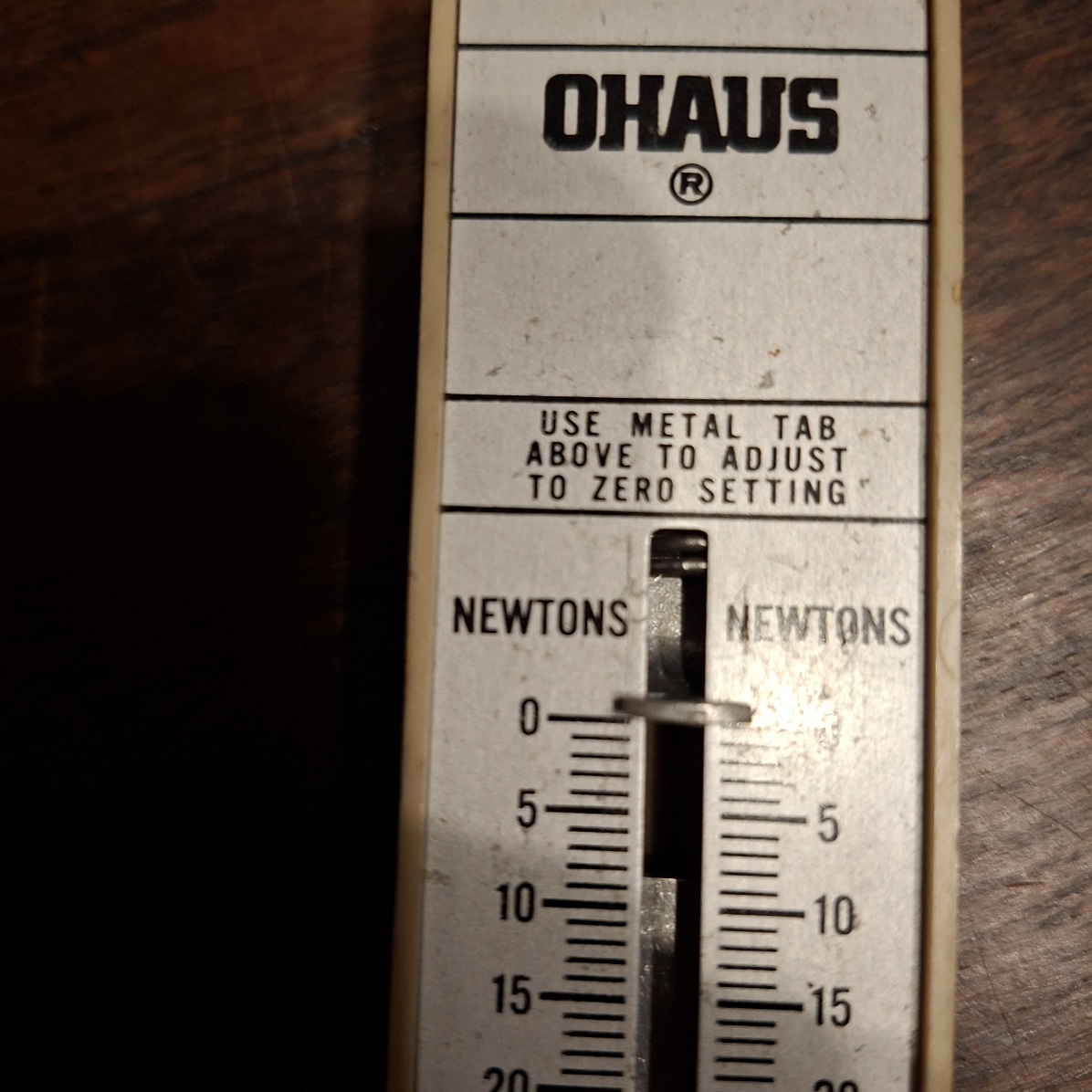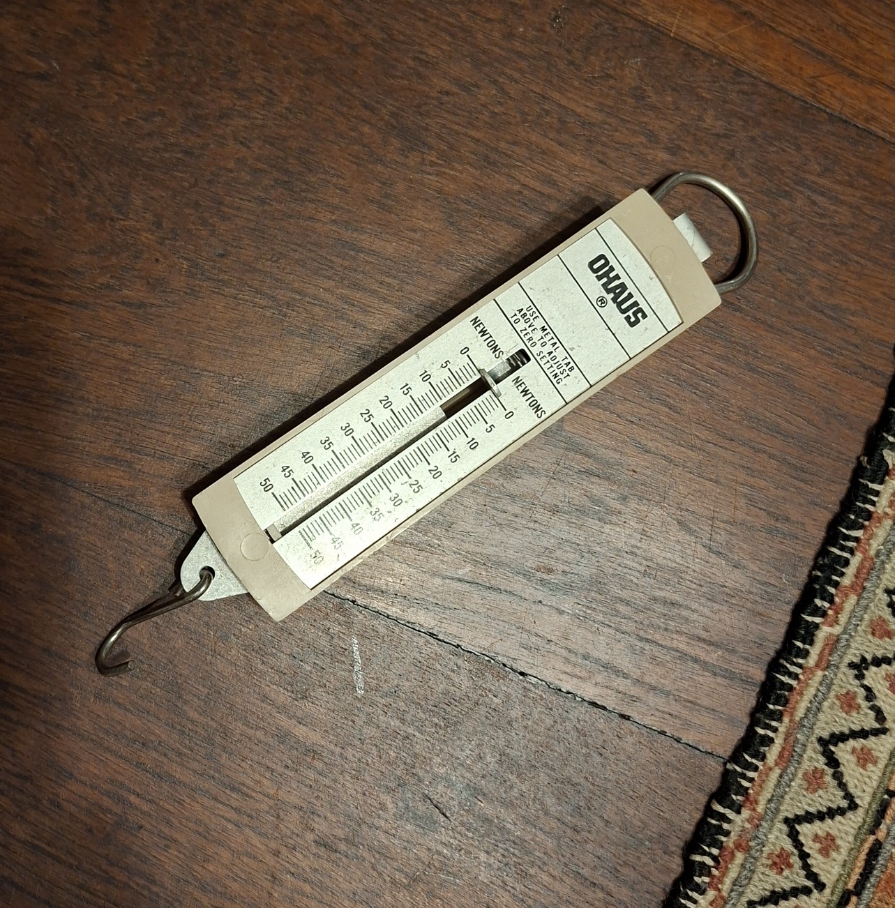 Ohaus spring balance Newtons scale  0 – 50.   Appears in good used condition.   Please look at the pictures and dont hesitate to ask any questions.   The scale has a metal tab to adjust to zero settings.  Hard plastic and metal.