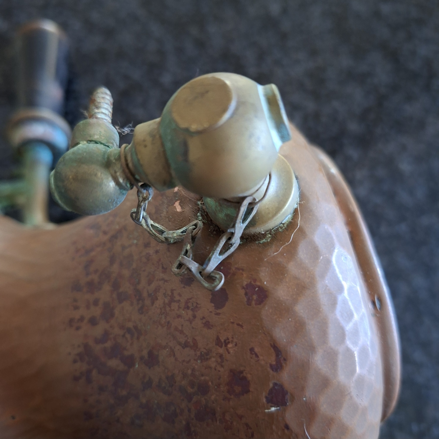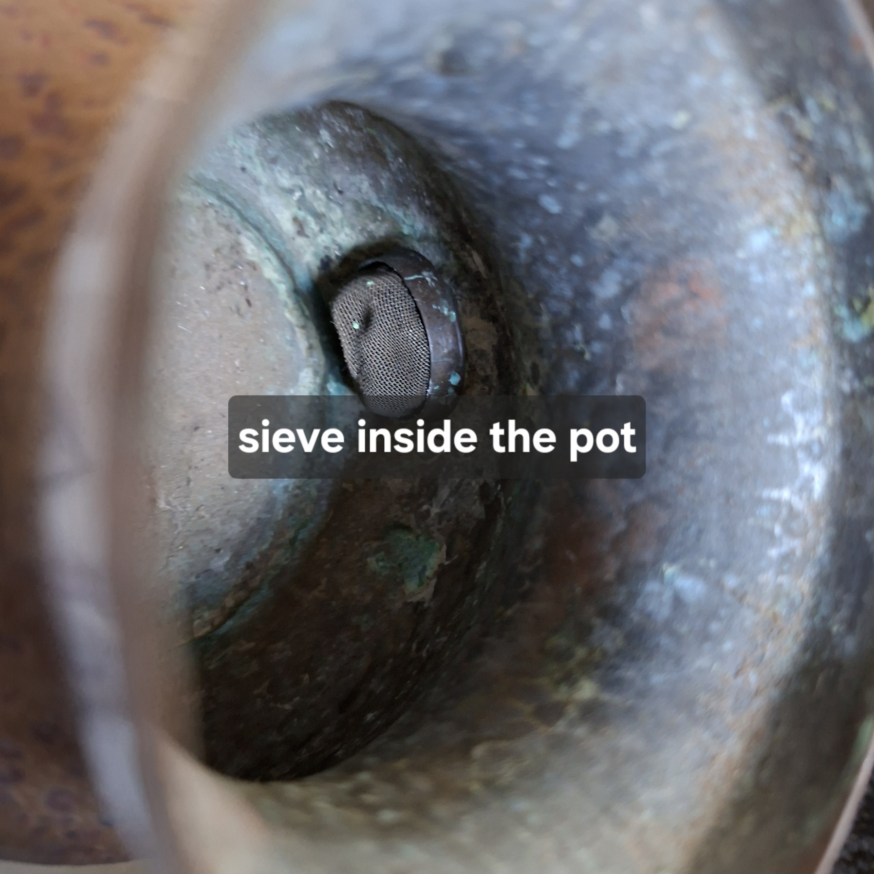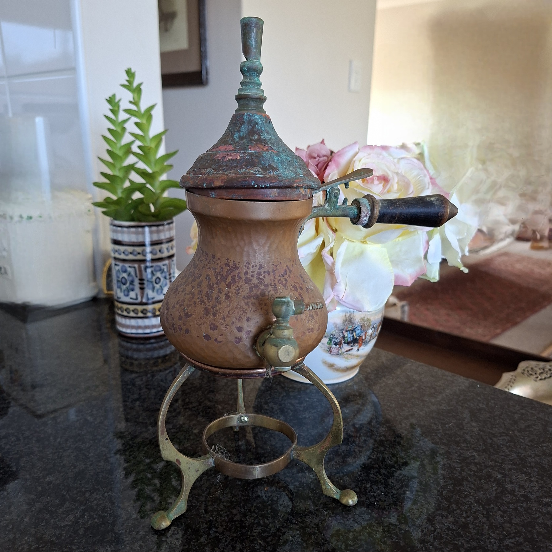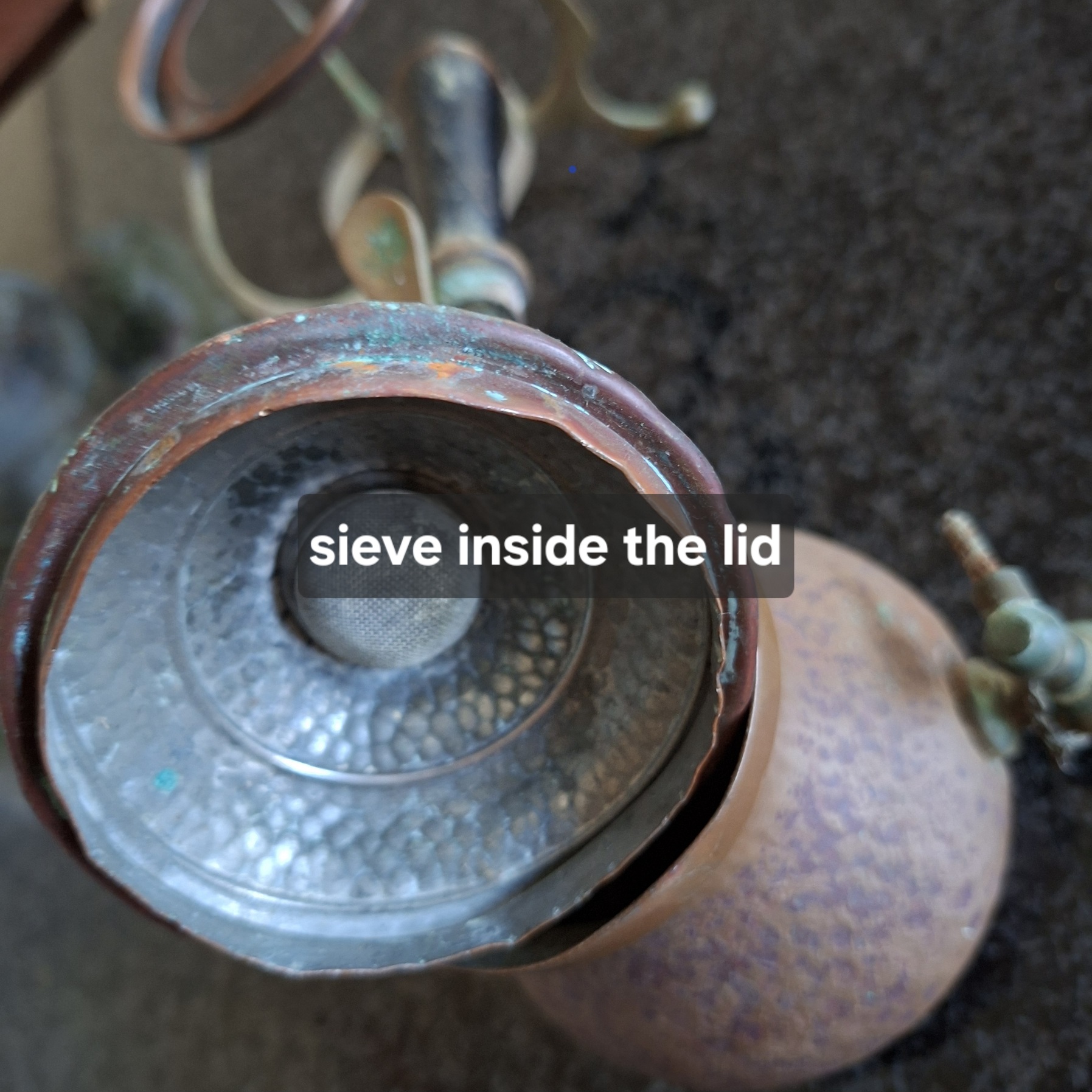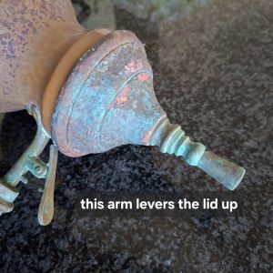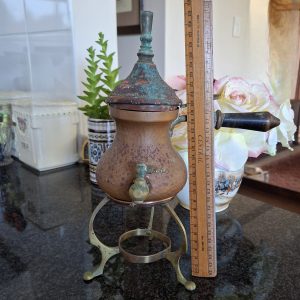 This item is really old and has been through the mill. It stands on a brass stand with a copper rim. The lid (lots of corrosion) fits onto the pot with a bit of persuasion and there is an interesting little lever that lifts the lid up without any difficulty. The mechanism that opens the tap at the bottom is stuck and the wooden handle is not there. There is a sieve in the lid as well as against the tap on the inside. Still a rather interesting item to have. With cleaning I think it will look fab.