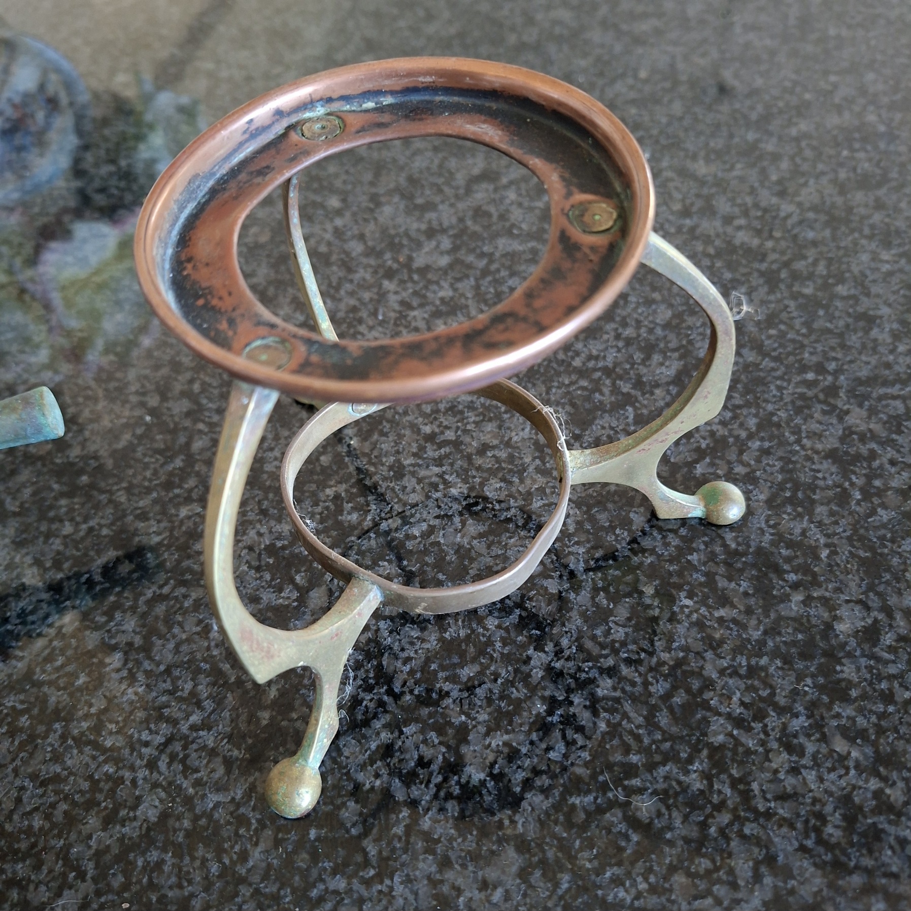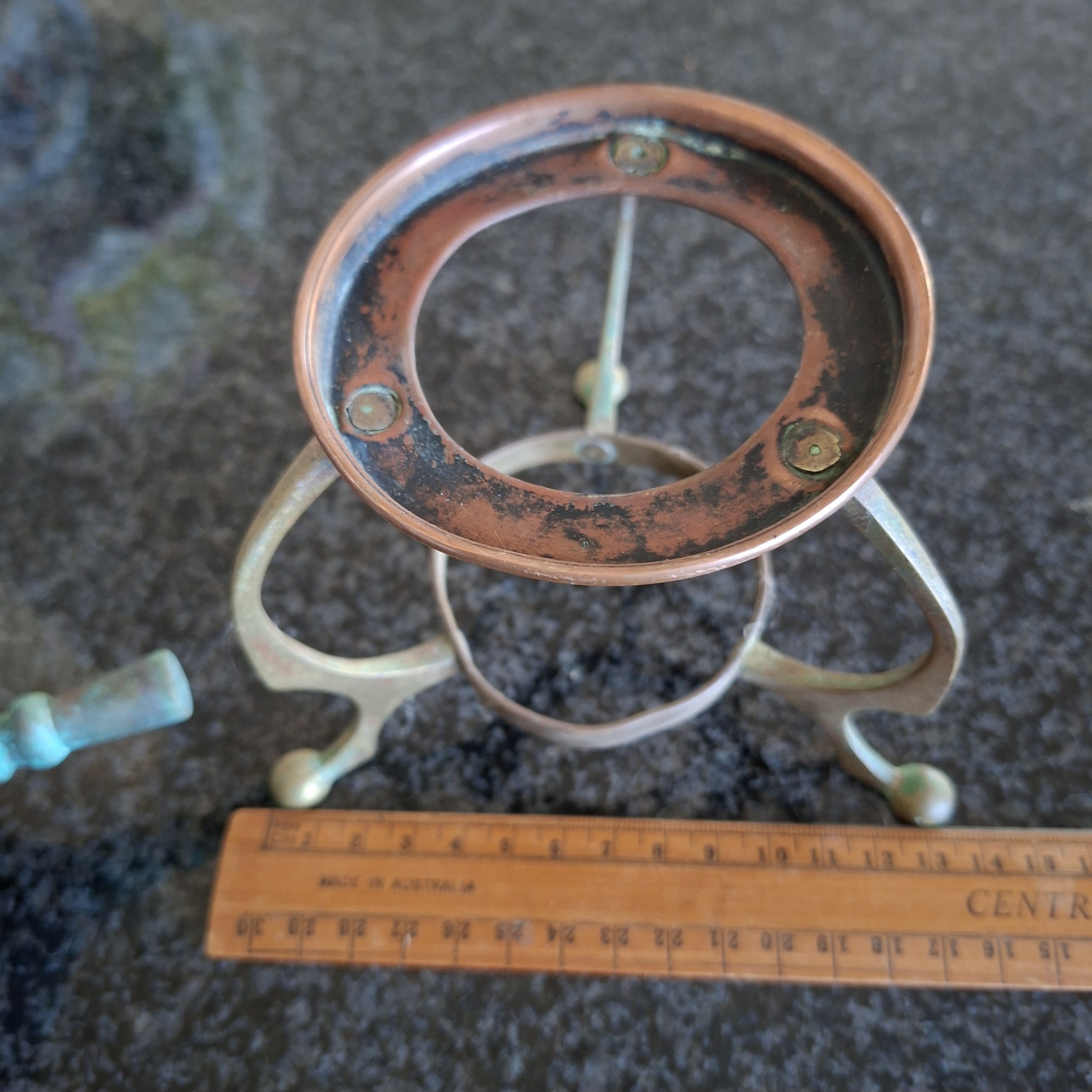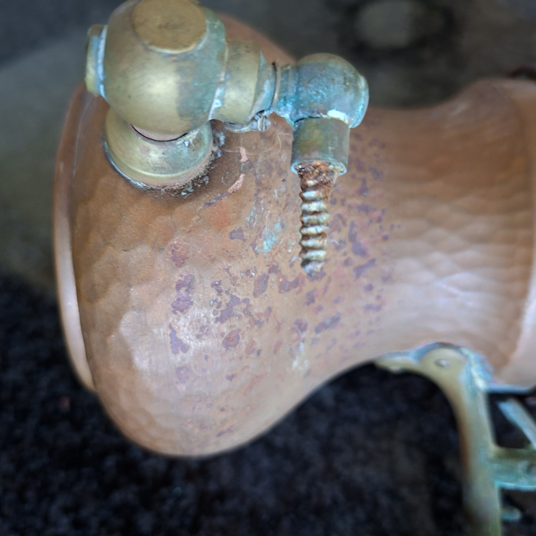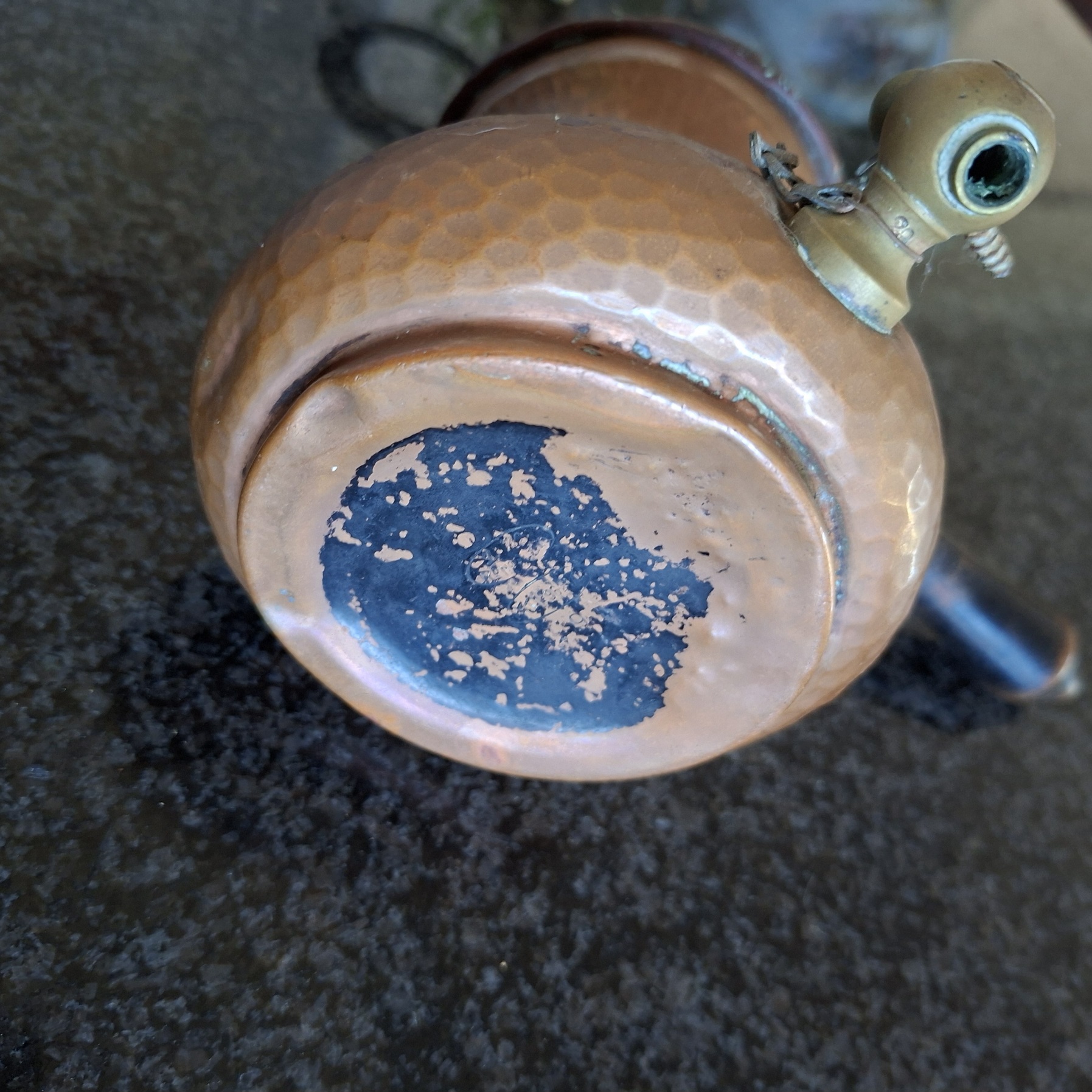This item is really old and has been through the mill. It stands on a brass stand with a copper rim. The lid (lots of corrosion) fits onto the pot with a bit of persuasion and there is an interesting little lever that lifts the lid up without any difficulty. The mechanism that opens the tap at the bottom is stuck and the wooden handle is not there. There is a sieve in the lid as well as against the tap on the inside. Still a rather interesting item to have. With cleaning I think it will look fab.