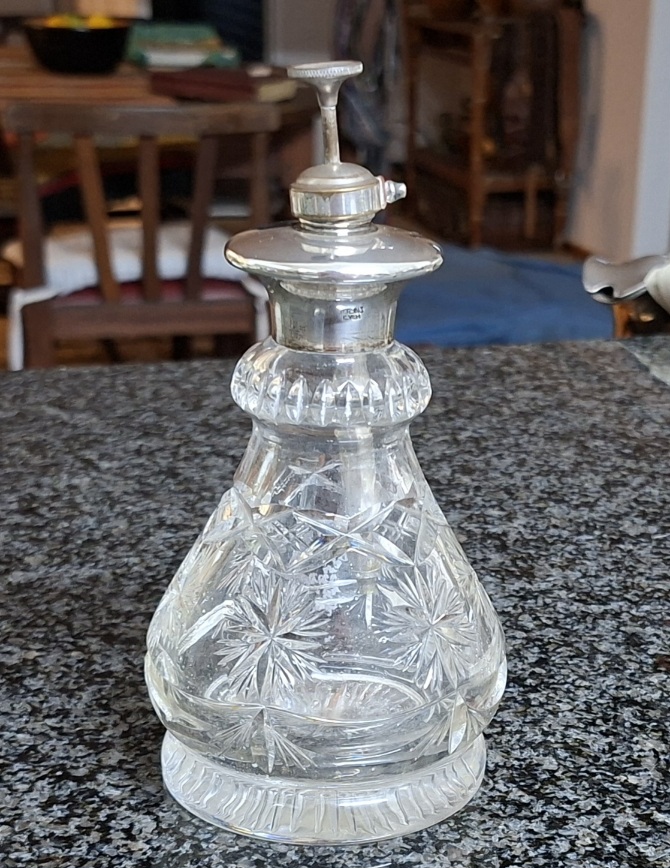 Perfume bottle, Silver Collar, crystal cut glass, atomiser – needs some attention. 17cms