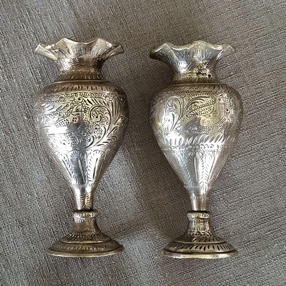Two heavy traditionally engraved and hammered Iranian brass vases. Leaf scrolls and birds. 12 cms tall. These generally differ in quality to Indian brasswork. You are welcome to ask questions.