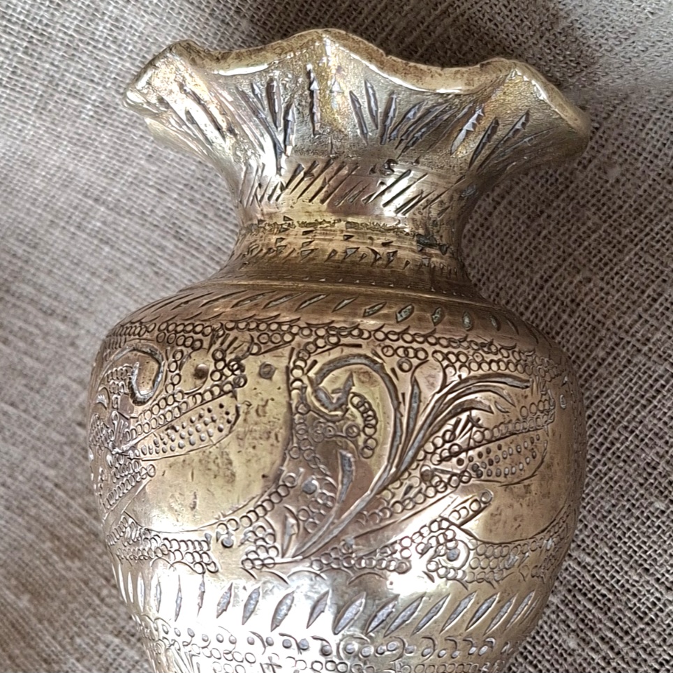 Persian brass vases – ornate birds and leaves – Iranian 12 cm tall
