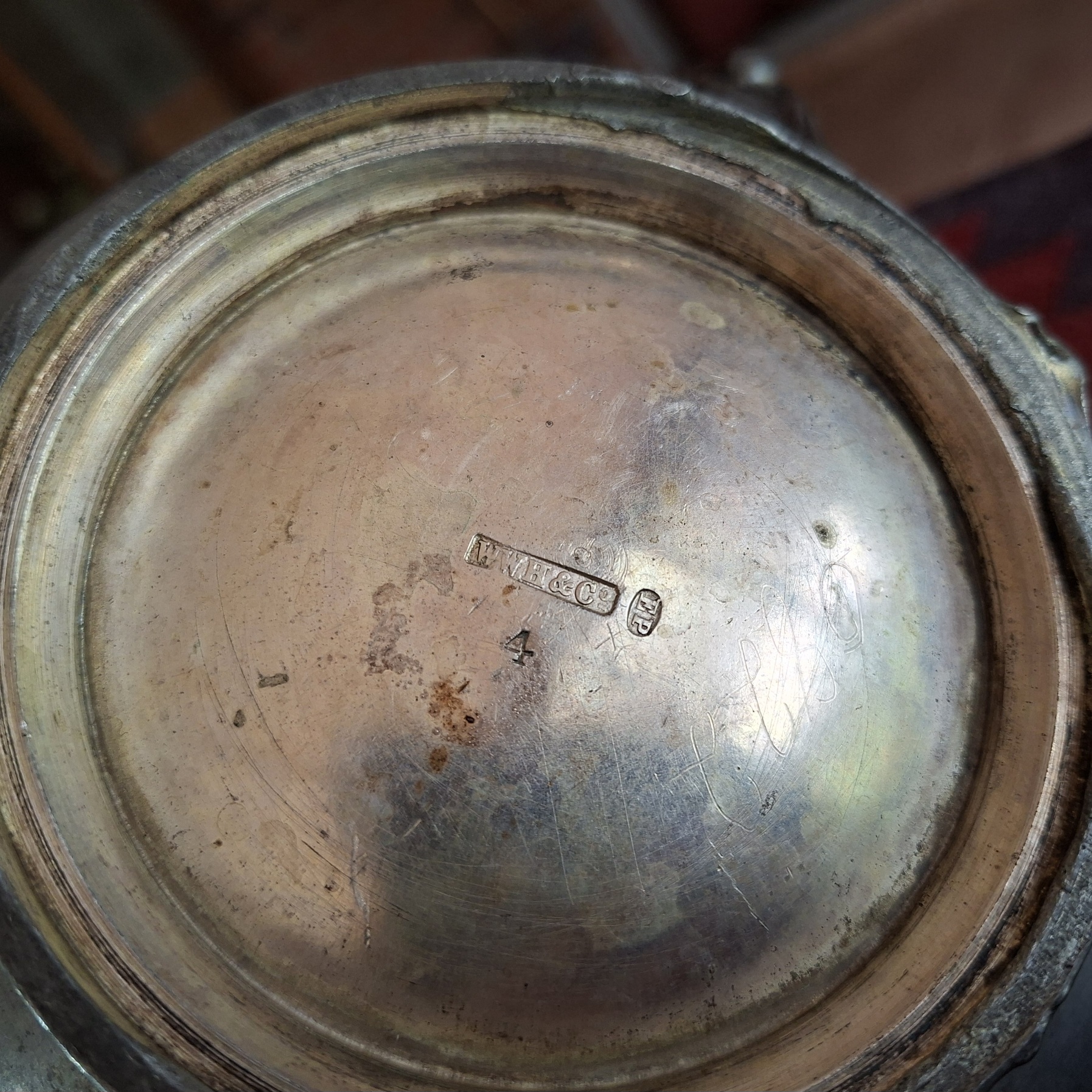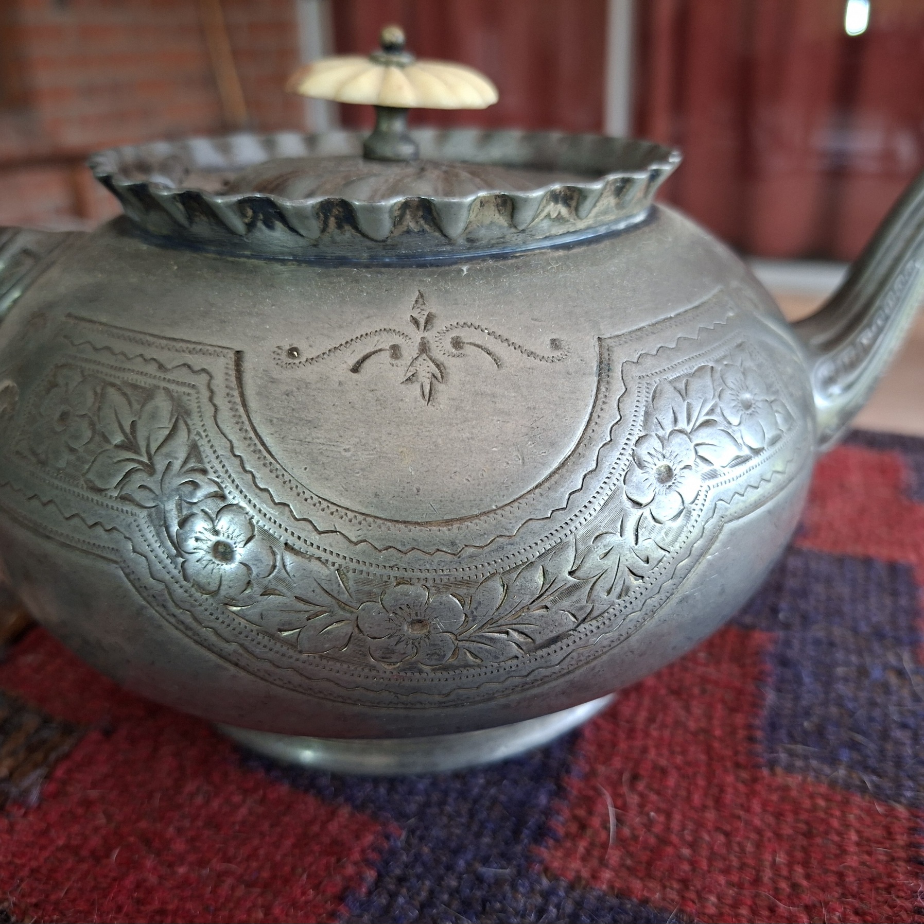 Antique pewter teapot from a collection.   Dont hesitate to ask any questions.  WWH and Co stamped under.  Please look at the pictures as to condition.  This is an old and well used tea pot with plenty of character.  Nice etched designs.   Some dents and scrapes as one would expect from an antique item which has been much used.    Questions welcome.