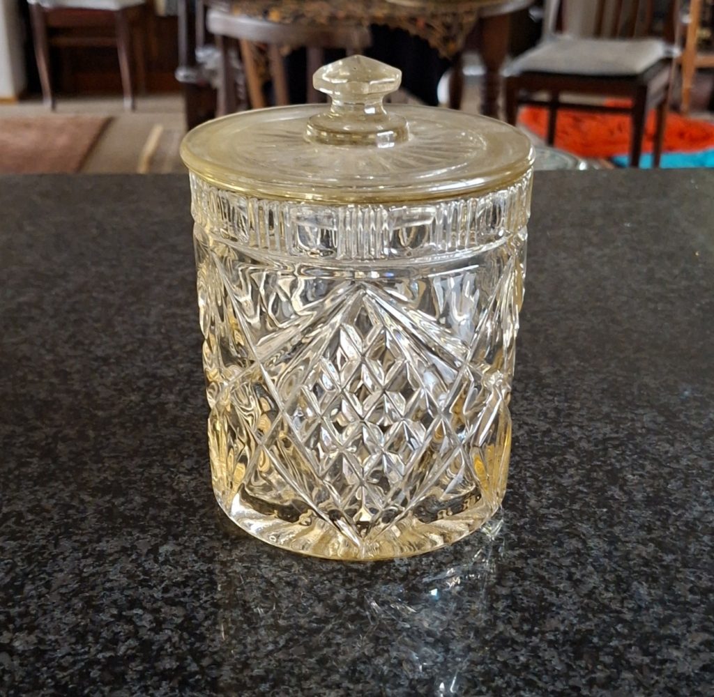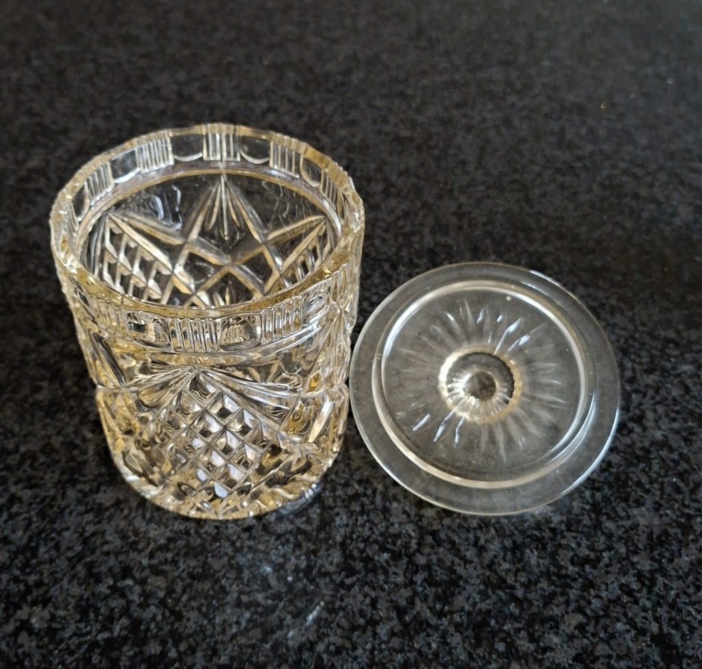 Be the first to review “Pressed Glass Jar – Ice bucket – biscuit barrel – in original chrome carry caddy” Cancel reply