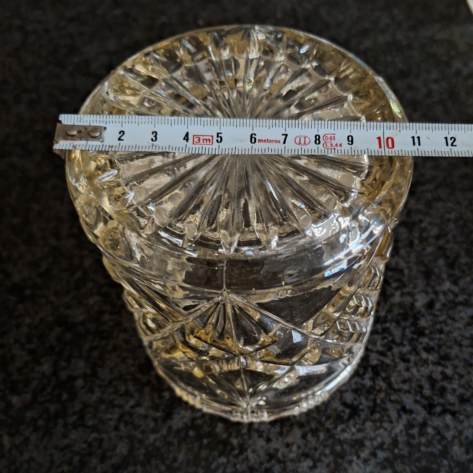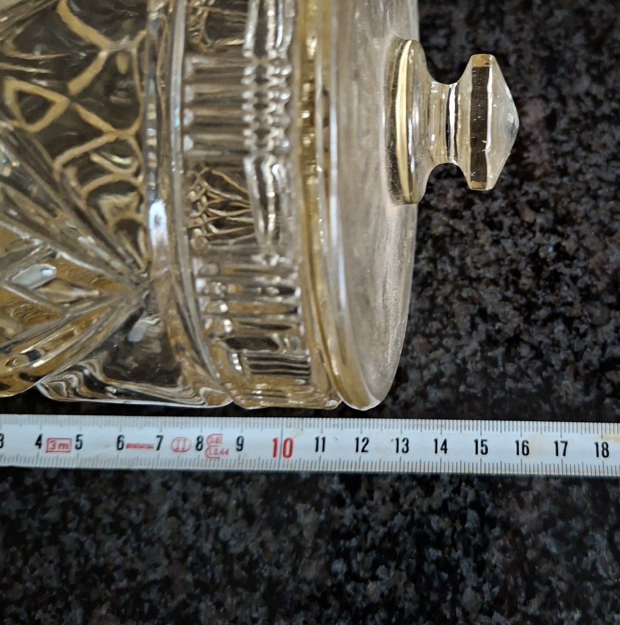 Heavy deeple “cut” pressed glass lidded biscuit barrel or ice bucket set in its original chrome carry caddy. In good vintage condition no chips or cracks. This jar is honey coloured glass which is unusual. Please look at the pictures and dont hesitate to ask any questions.