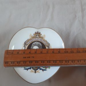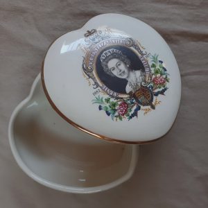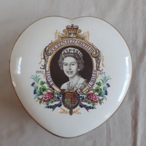 Be the first to review “QE 2 Silver Jubilee – heart shaped trinket bowl with lid – floral”
