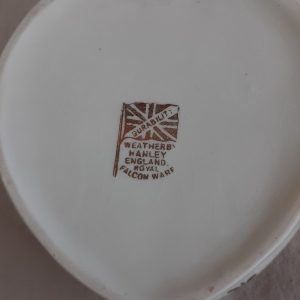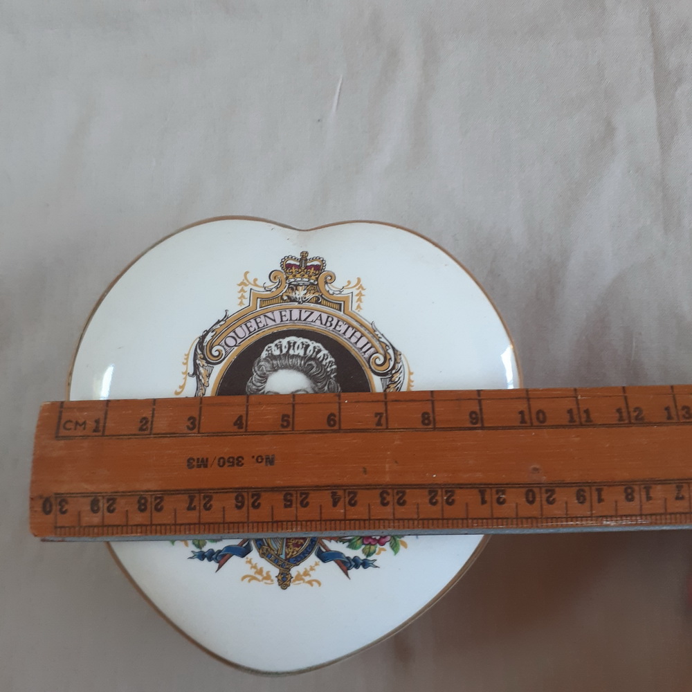 Queen Elizabeth silver jubilee heart shaped trinket box.    In good used vintage condition.  No issues.   Falcon Ware.    Dont hesitate to ask any questions.