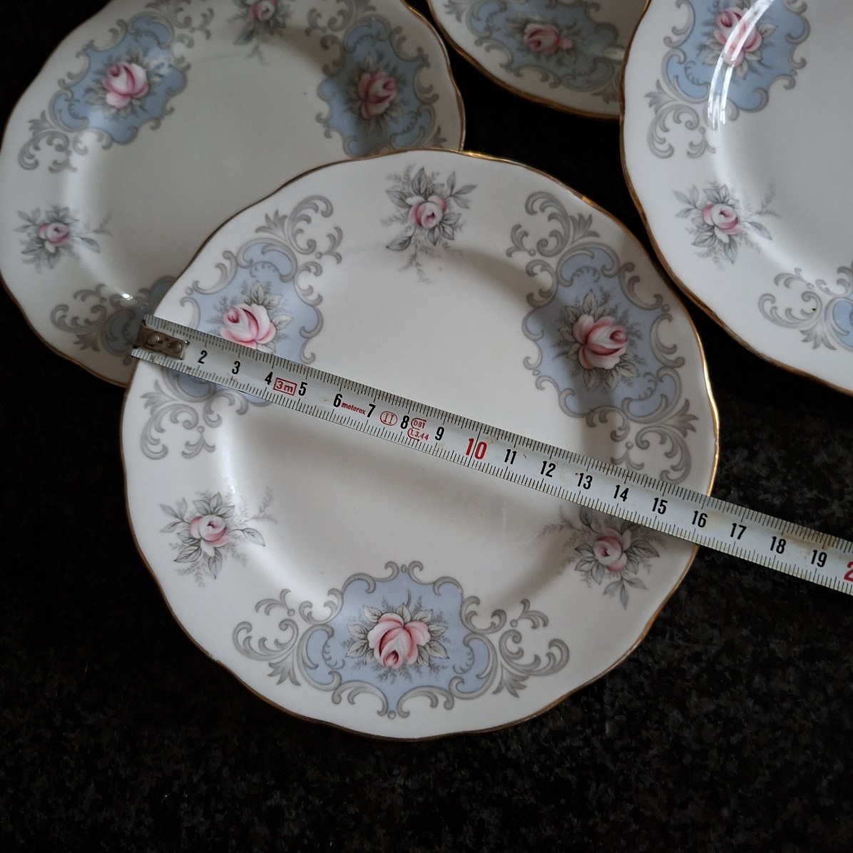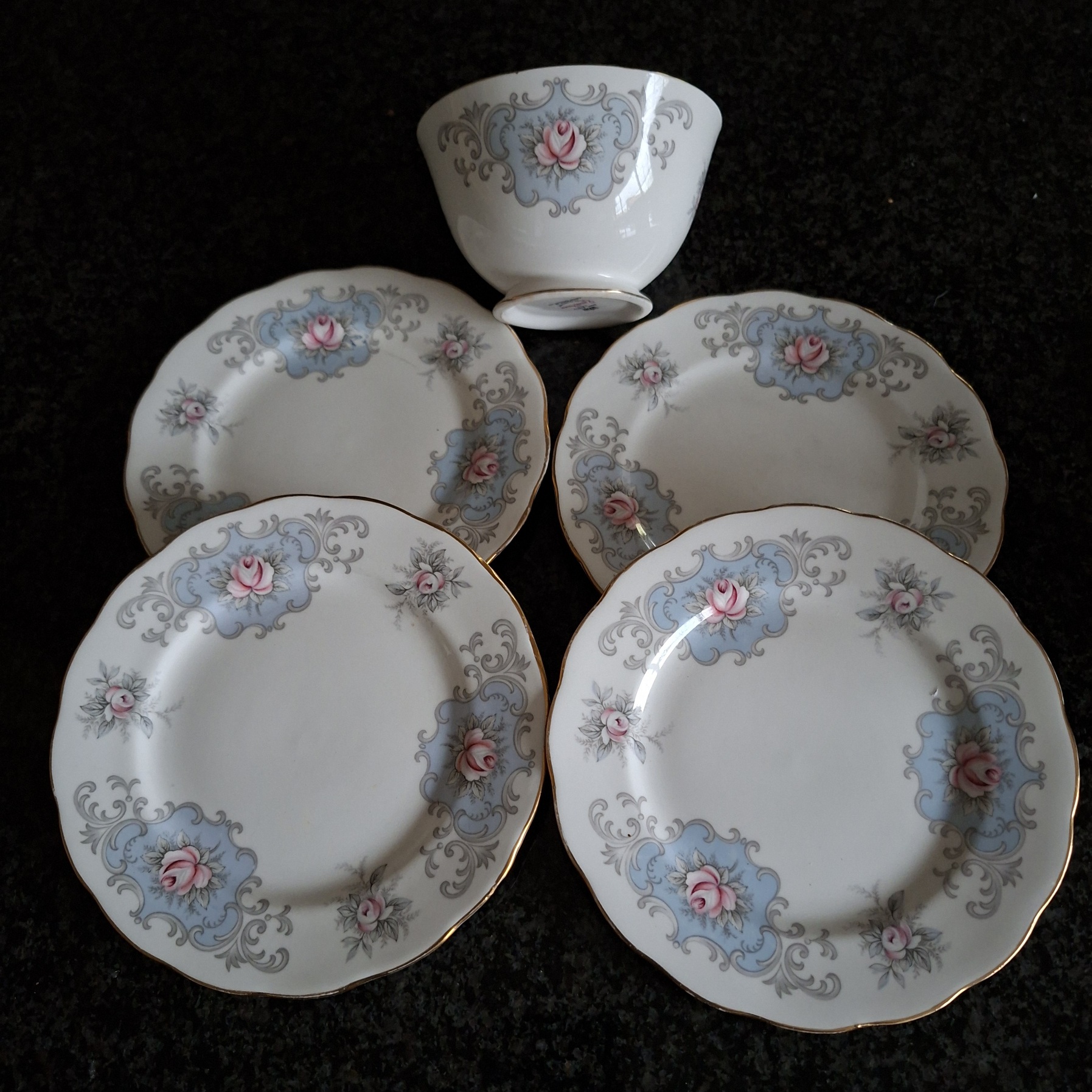 1 Queen Anne sugar bowl and 4 small cake plate. Roses on blue with white. In nice used vintage condition. Dont hesitate to ask any questions.