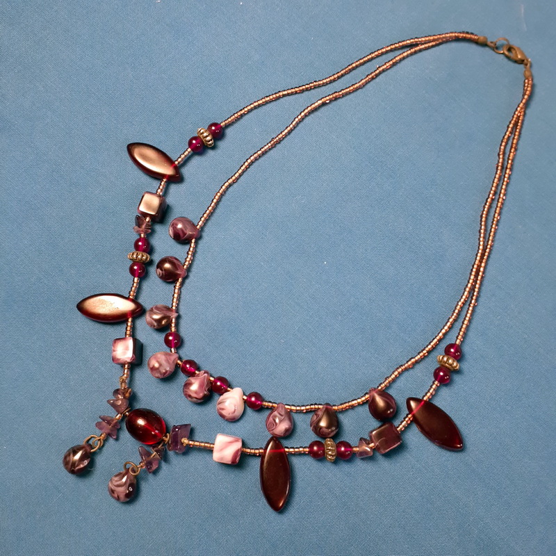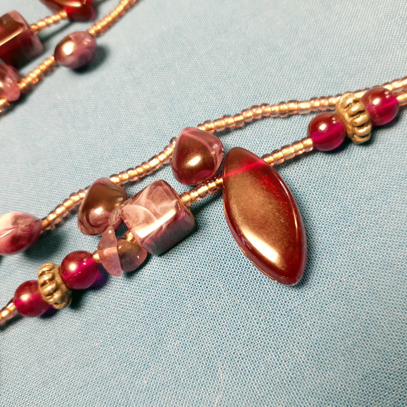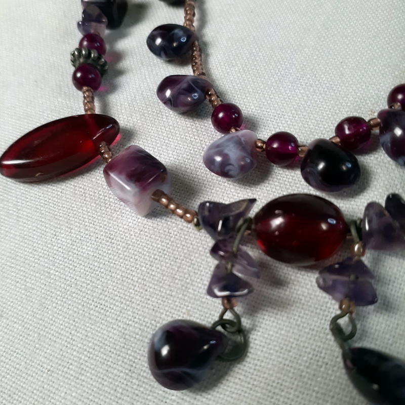 Deep Red glass necklace with a couple of small tumbled stones. Please look at the pictures carefully as they form part of my description.    Dont hesitate to ask questions.