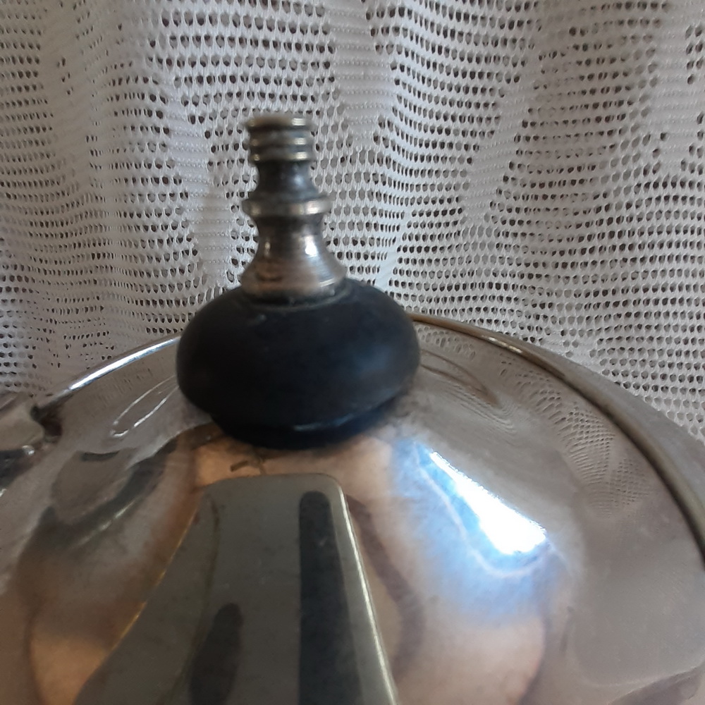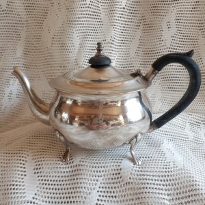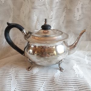 Yeoman plate vintage silver plated tea pot.  In nice used vintage condtition.  Some paint or other substance on the handle which I trust can be cleaned off.  (see pictures)  No damage to the tea pot. Tea Pot stands on 4 feet.    These old pots look wonderful with fresh garden flowers.