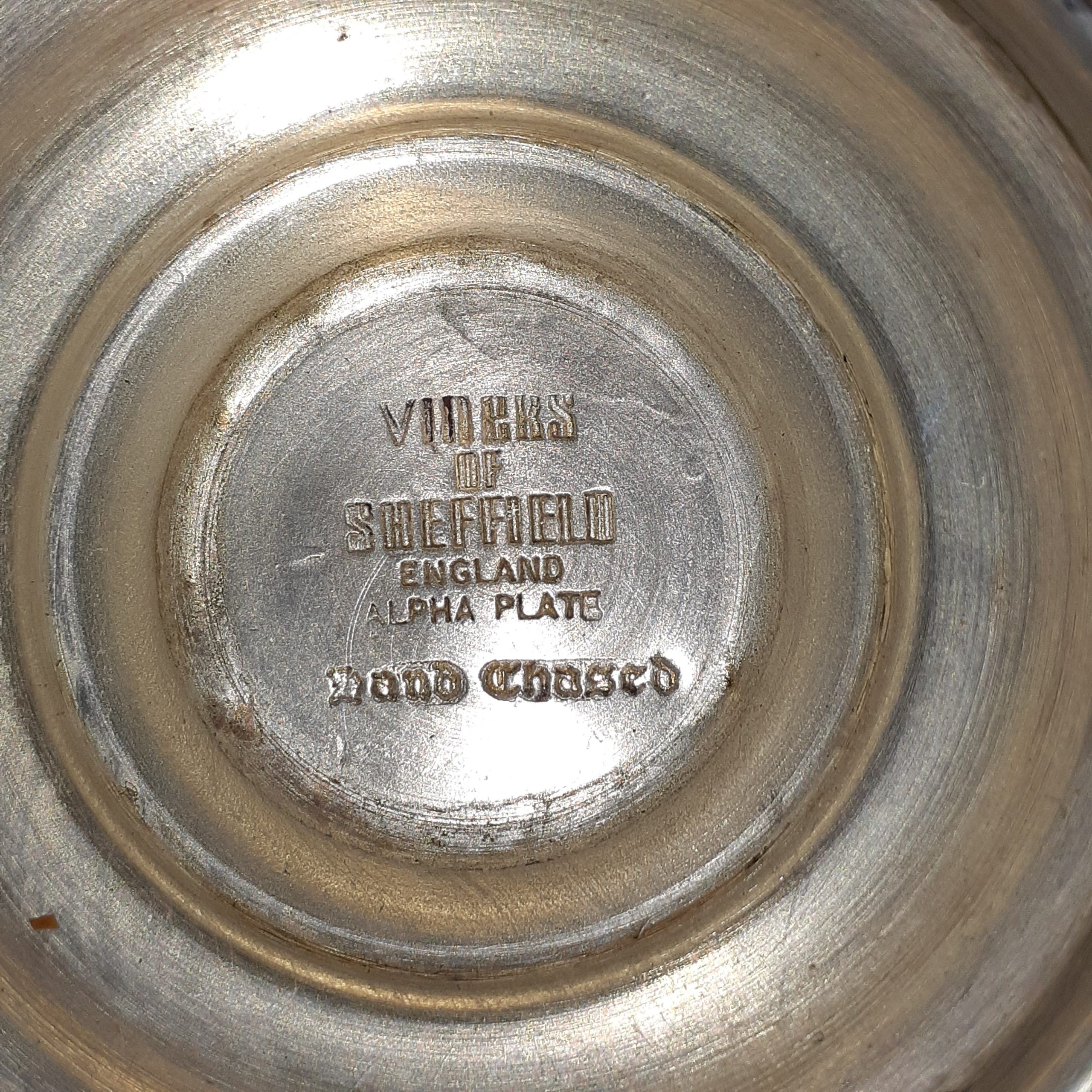 Very nice Viners of Sheffield Sugar Castor. Silver plate on (appears to be copper) and hand chased. A small dent in the rim of the base but it stands firmly. I have not cleaned this castor. The silver plating only has wear around the rim where one takes the top off to fill the shaker. Dont hesitate to ask any questions