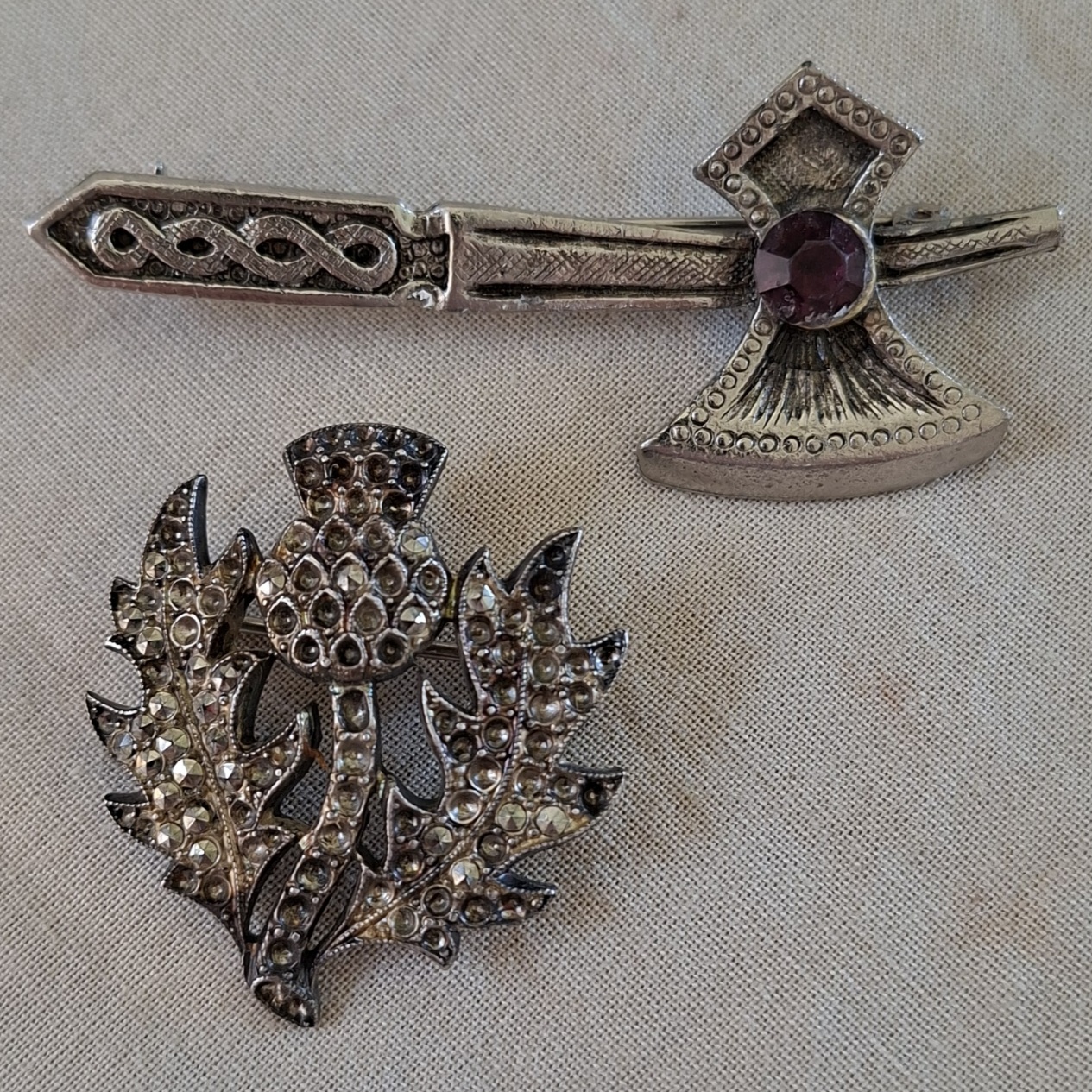 Two Celtic brooches. The axe has a purple coloured glass stone which is slightly crookedly set and the marcasite brooch has many marcasites missing despite this, its a nicely made solid brooch with a good rollover pin. Dont hesitate to ask any questions.