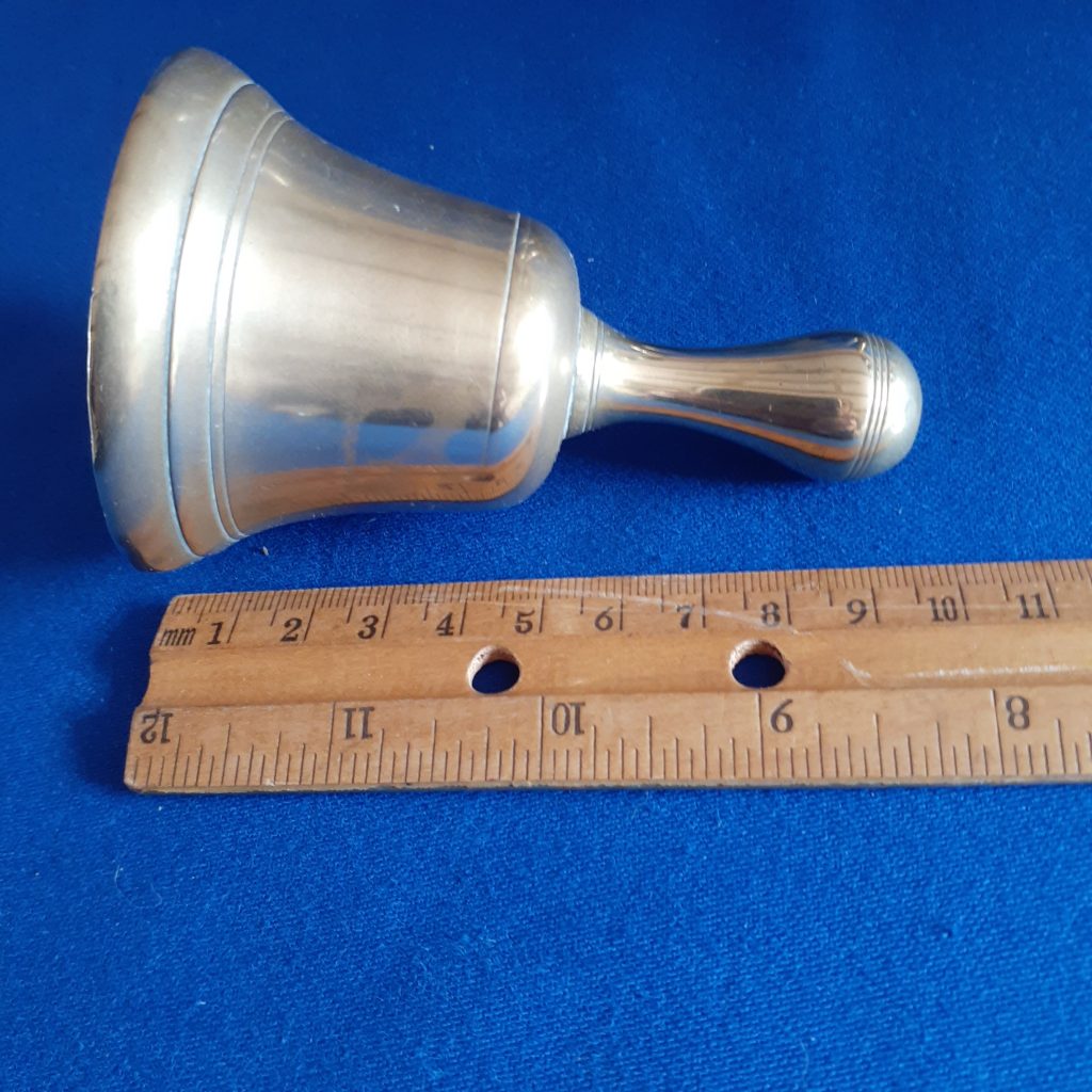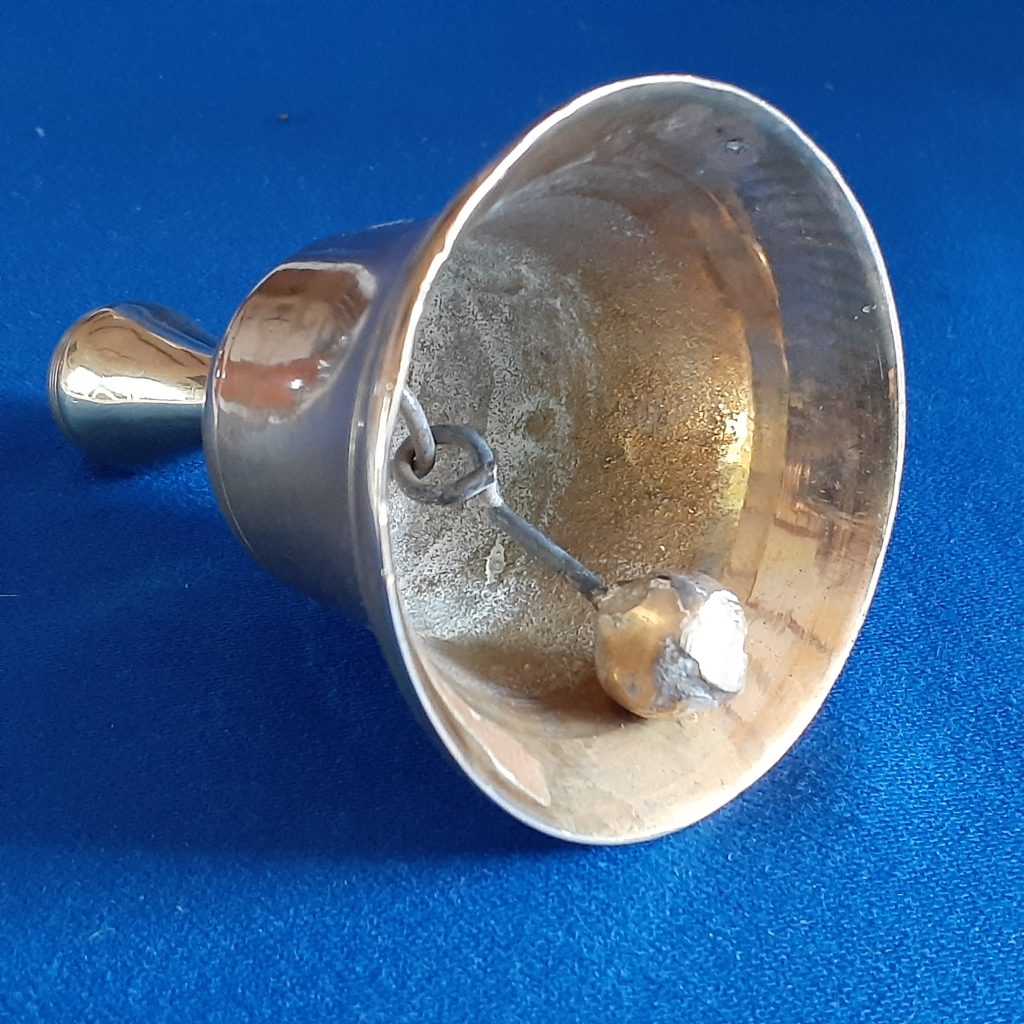 Neat sturdy table bell in brass. Clapper in tact. What looks like blue around the handle is only a reflection!! Pse look at pictures and dont hesitate to ask any questions.