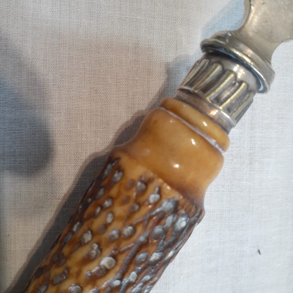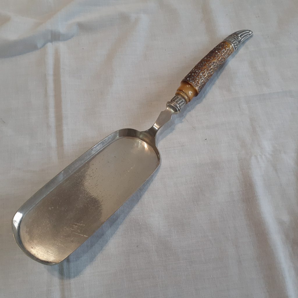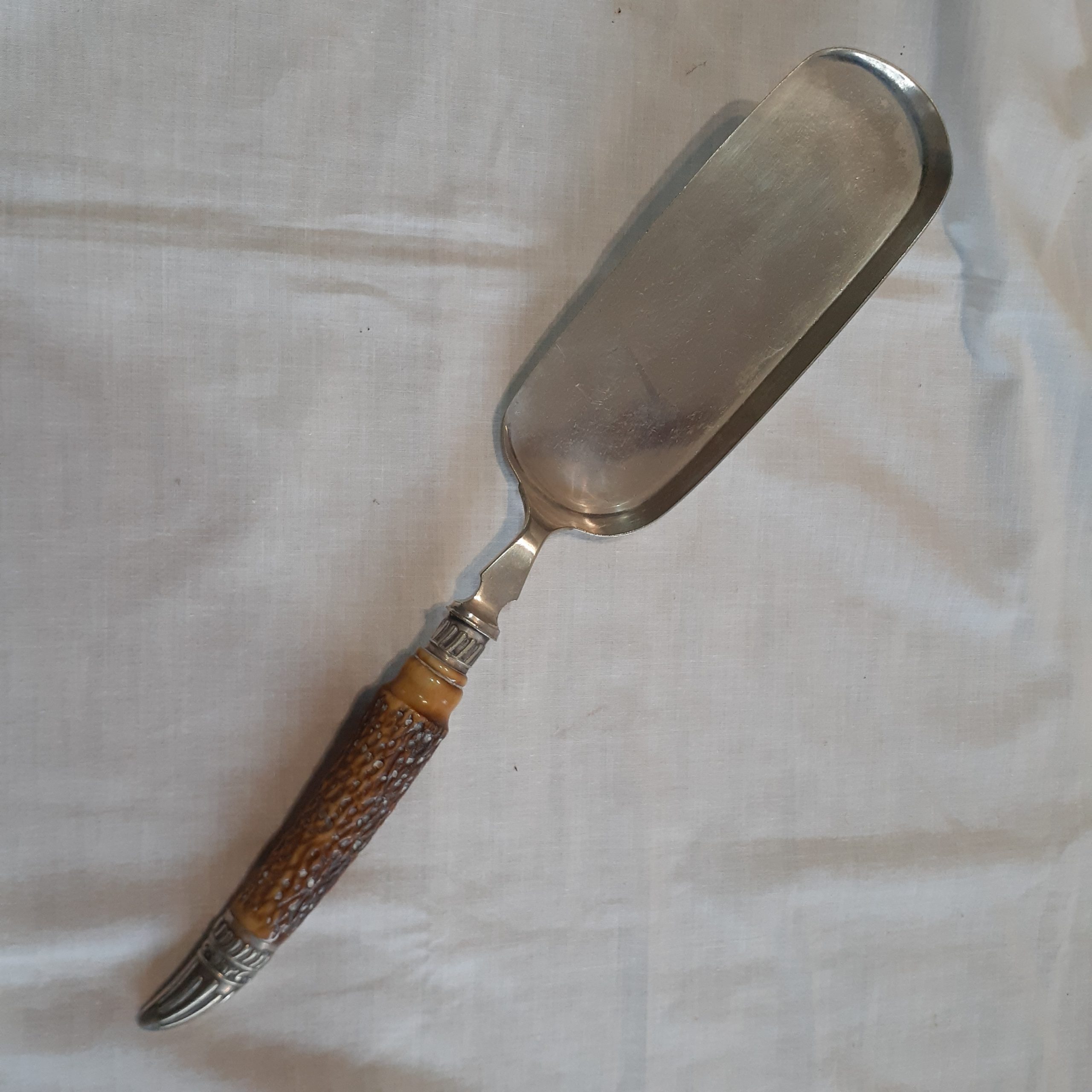Very good condition – antique crumb tray with stag horn handle and silverplate decoration. Some signs of wear but the collar and end piece are in good strong condition. Hallmarked HA EA FA. Please look at picatures and dont hesitate to ask questions.