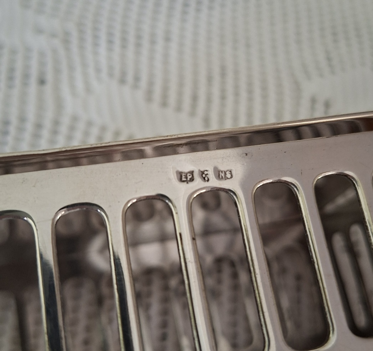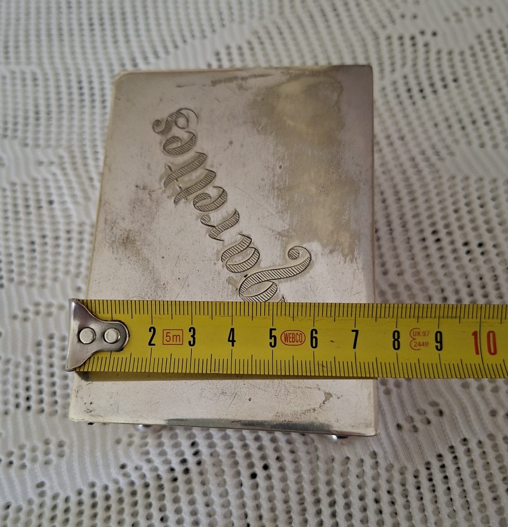 EPNS vintage table cigarette box. Lid approx 10 x 8 cms. 5.5 cms high. Some wear to the lid otherwise in lovely vintage condtion. Stands on 4 round feet. Questions Welcome.